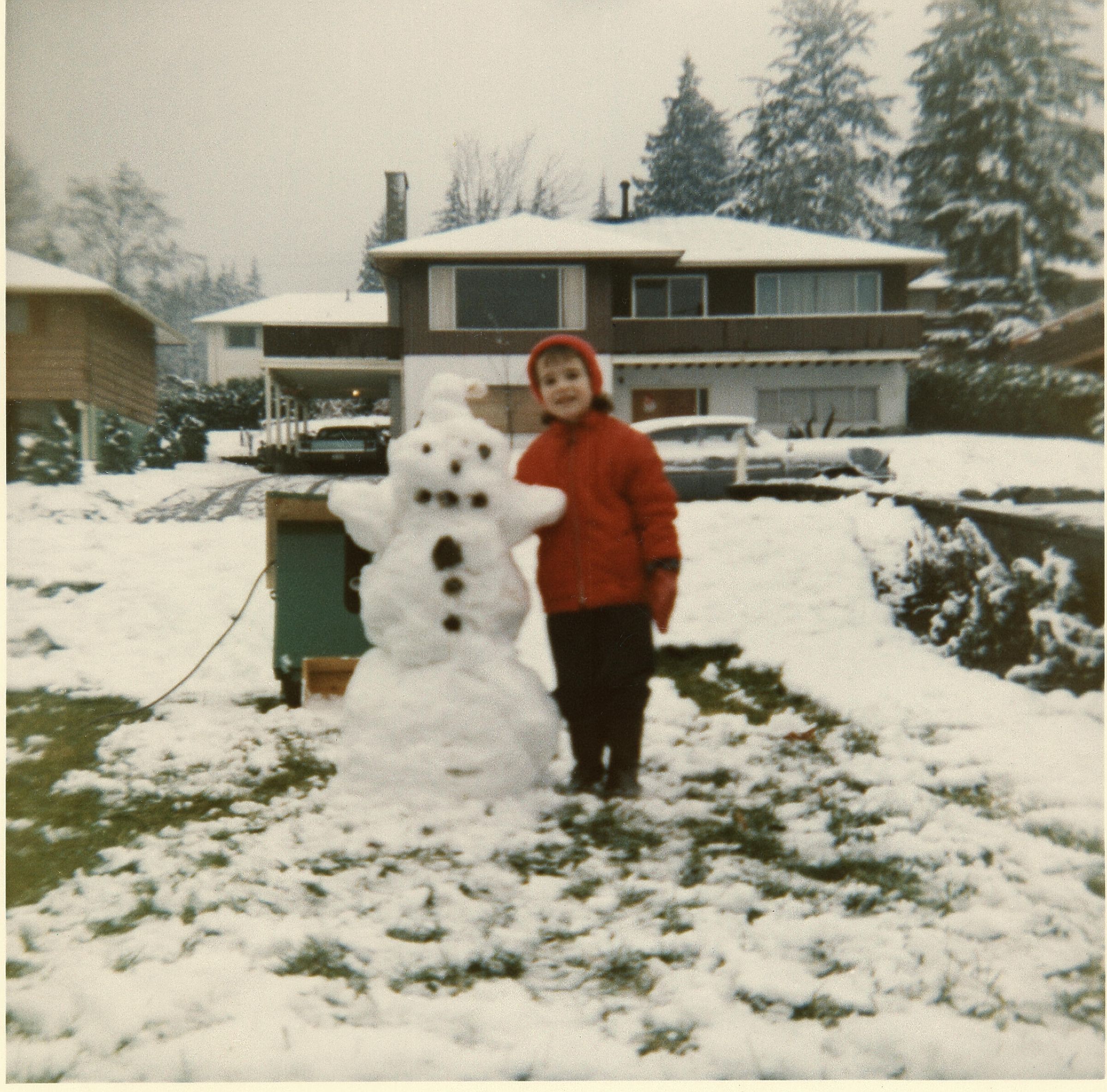 Colour photo of little girl in a red jacket standing beside a snowman infron of a house ( on other side of street).Collection