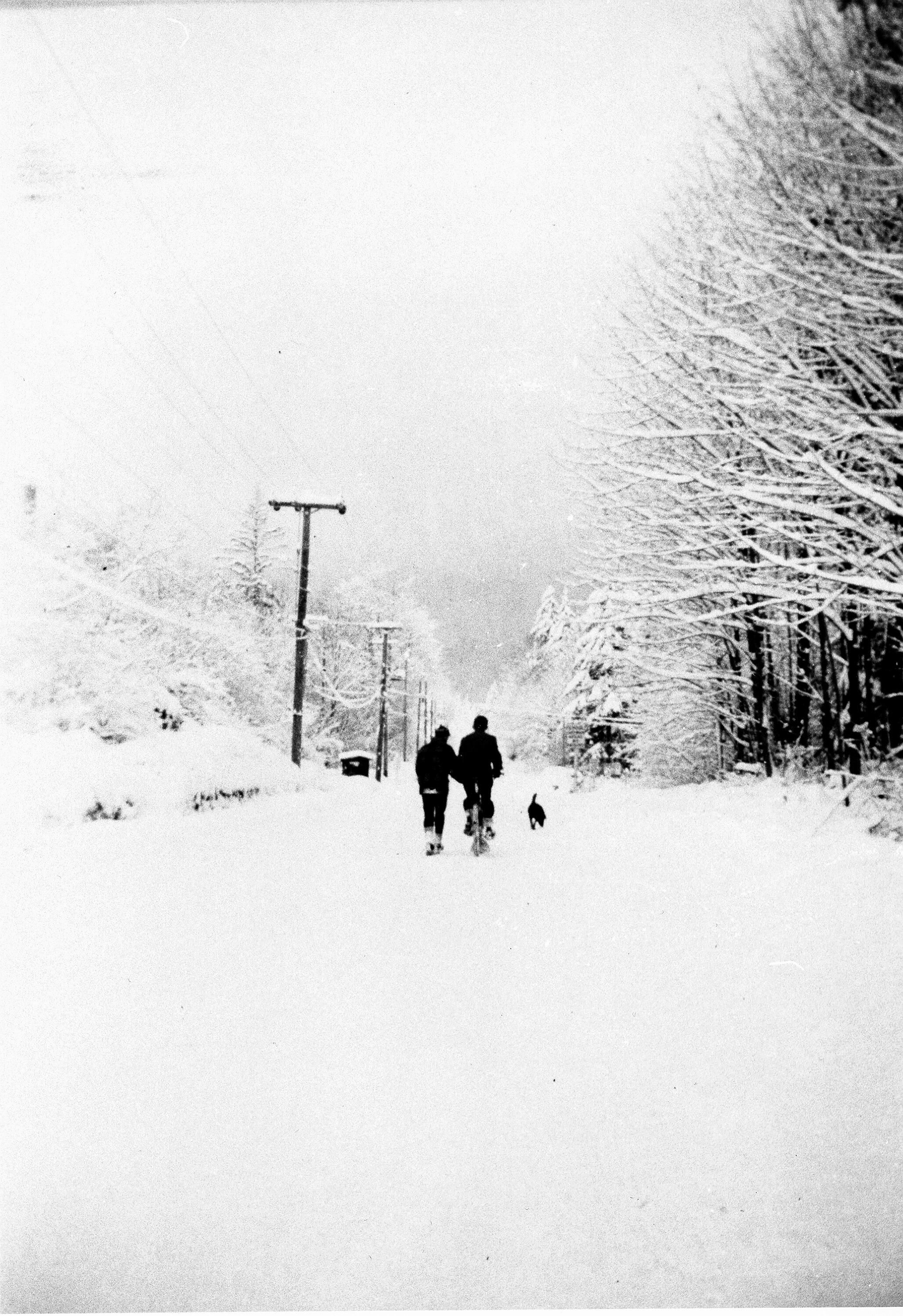 Dollarton Hwy, 2 people and dog in heavy snowfall