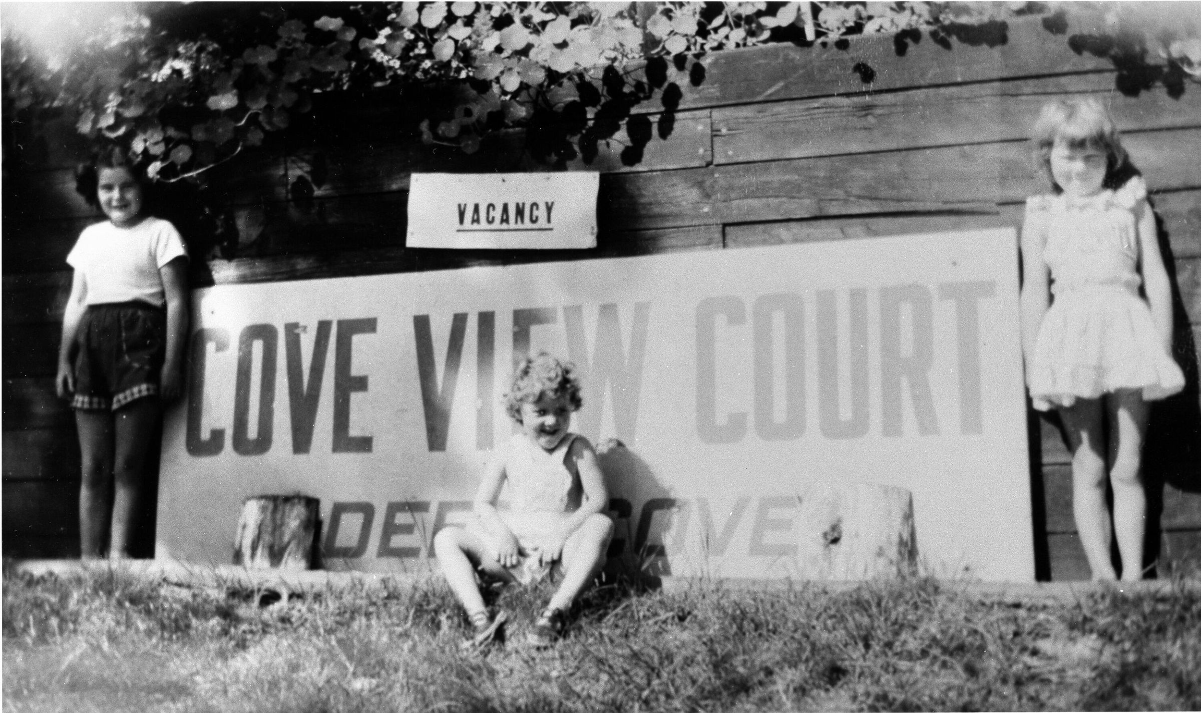 Deep Cove Motel sign; l to r Sharon, Nickie Thornley, Wendy ThornleyDescription