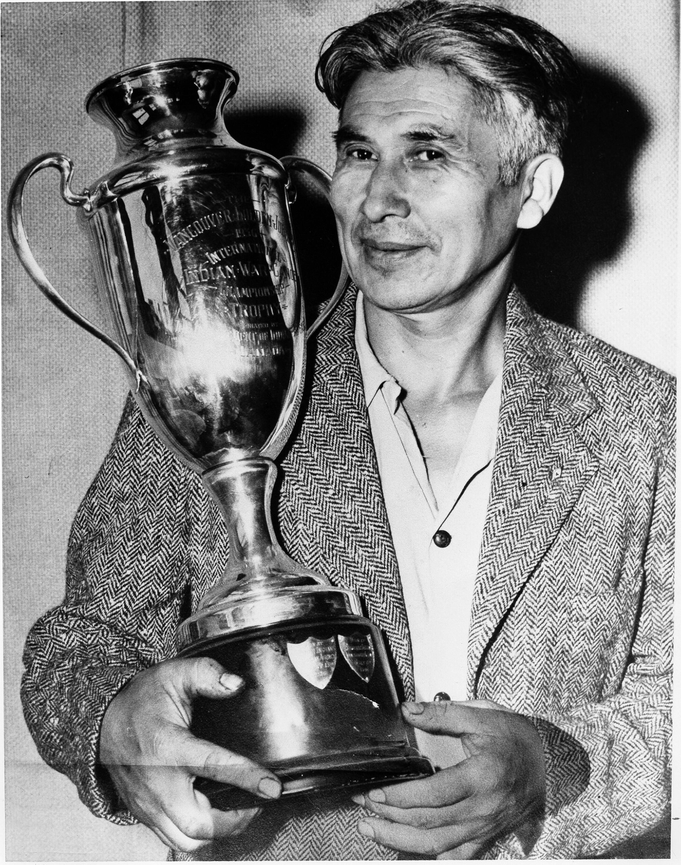 George, Dan holding War Canoe Trophy