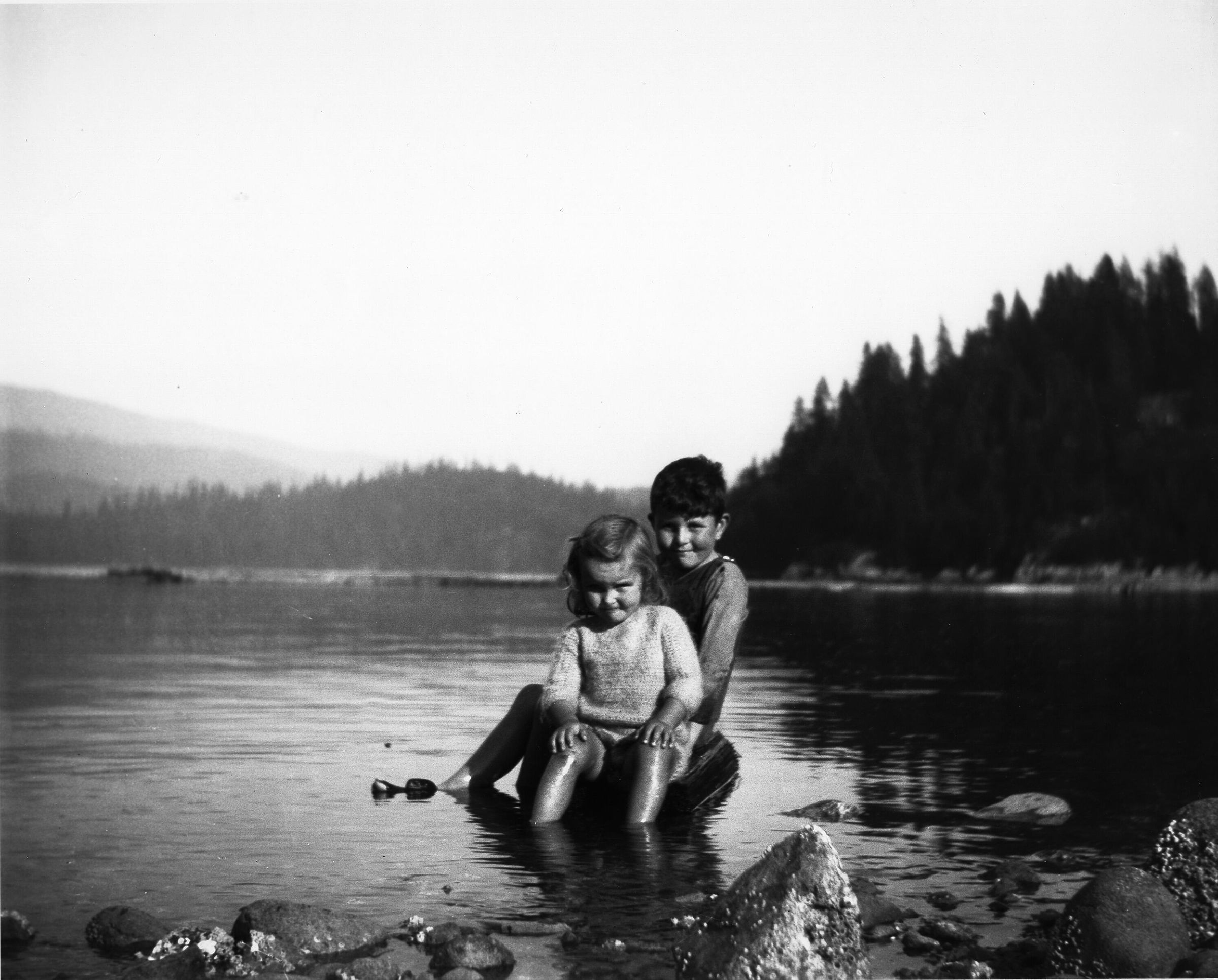 Two Childern ( boy and girl) sitting together on rock in shallow water on the beach. South tip of Deep Cove in background.Collection