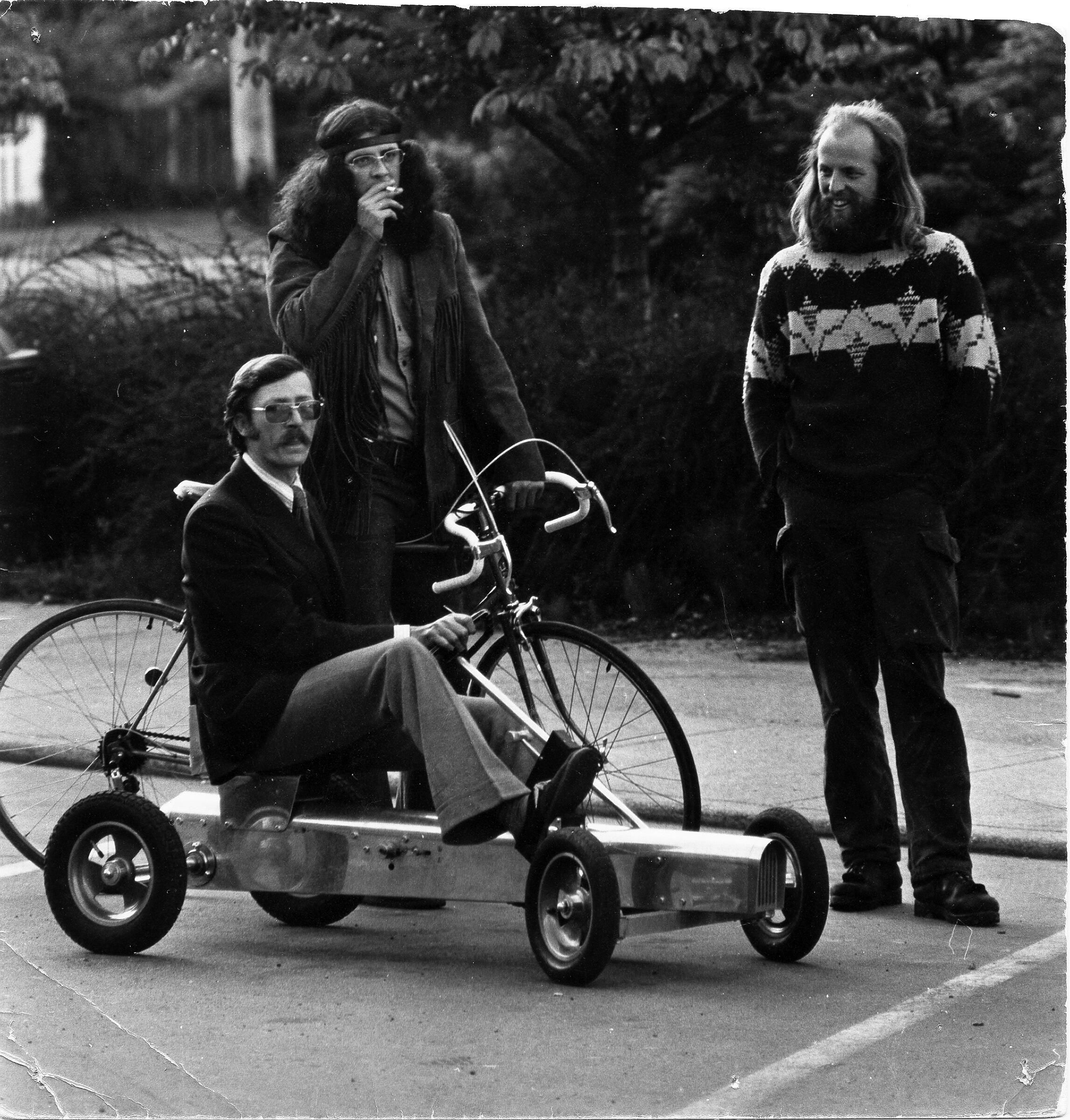 Local Characters - three men. Two standing, one holding bike. The third man sitting on a go-cart ( in suit) - Adrian Schweitzer Collection