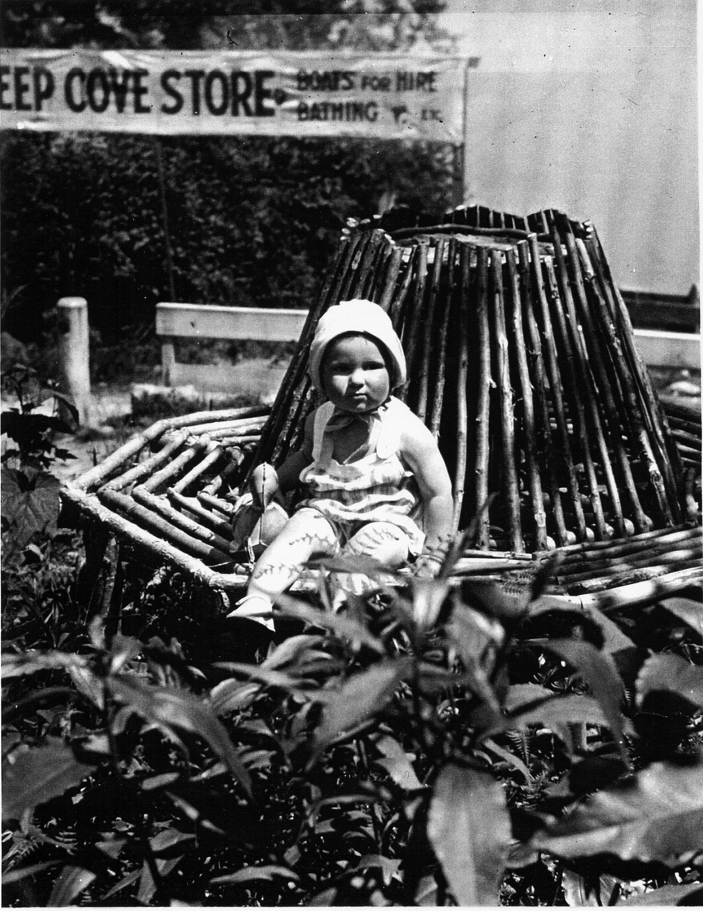 Reta (Cumming) Brawn in Deep Cove. Toddler sitting on round bench looking at camera.