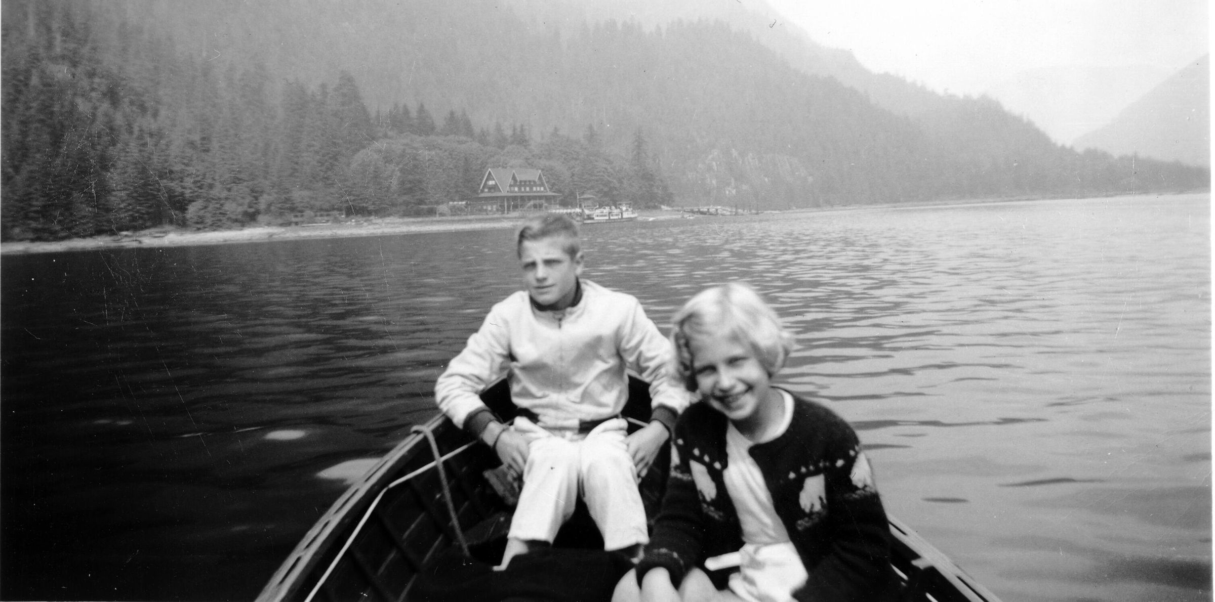 Kids in boat with Wigwam Inn in background
