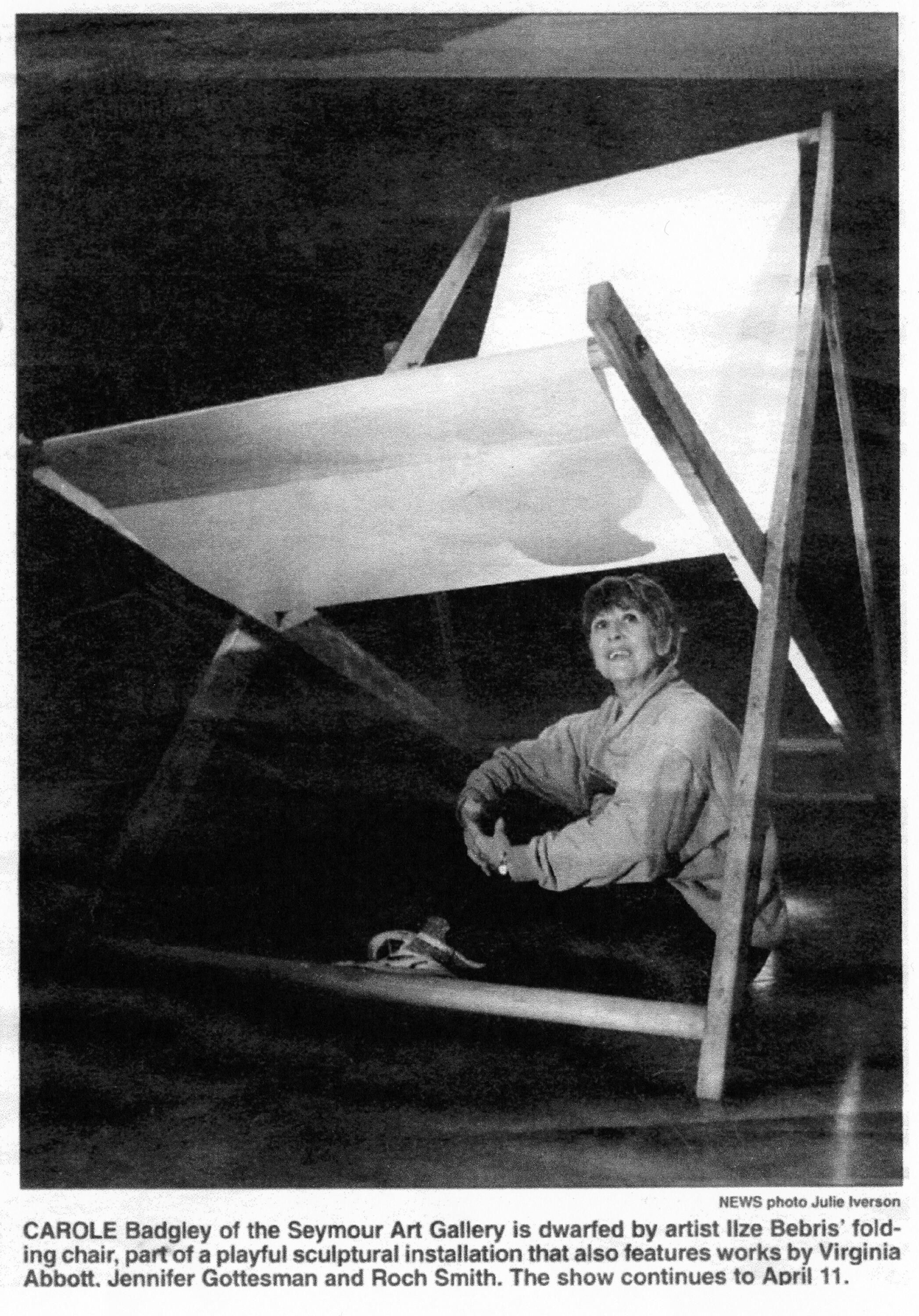 Gigantic to Miniature show photo. Curator Carole Badgley under Ilze Bebris folding chair.Description