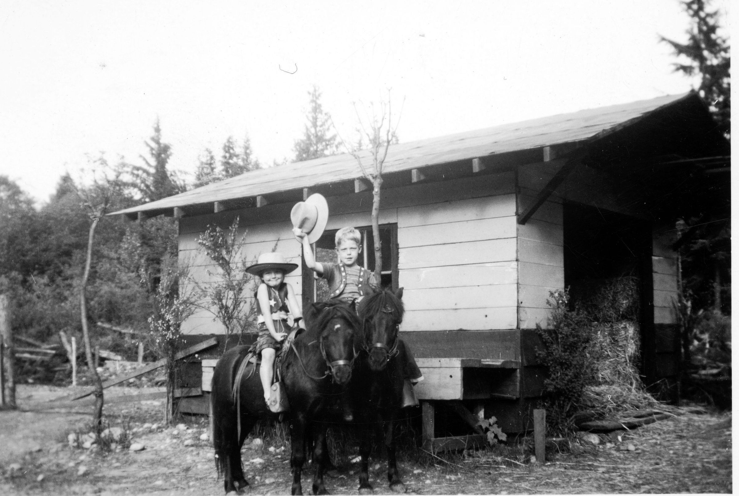 Terry & Sharon Hogan on horses, cowboy hats, 1945.tif