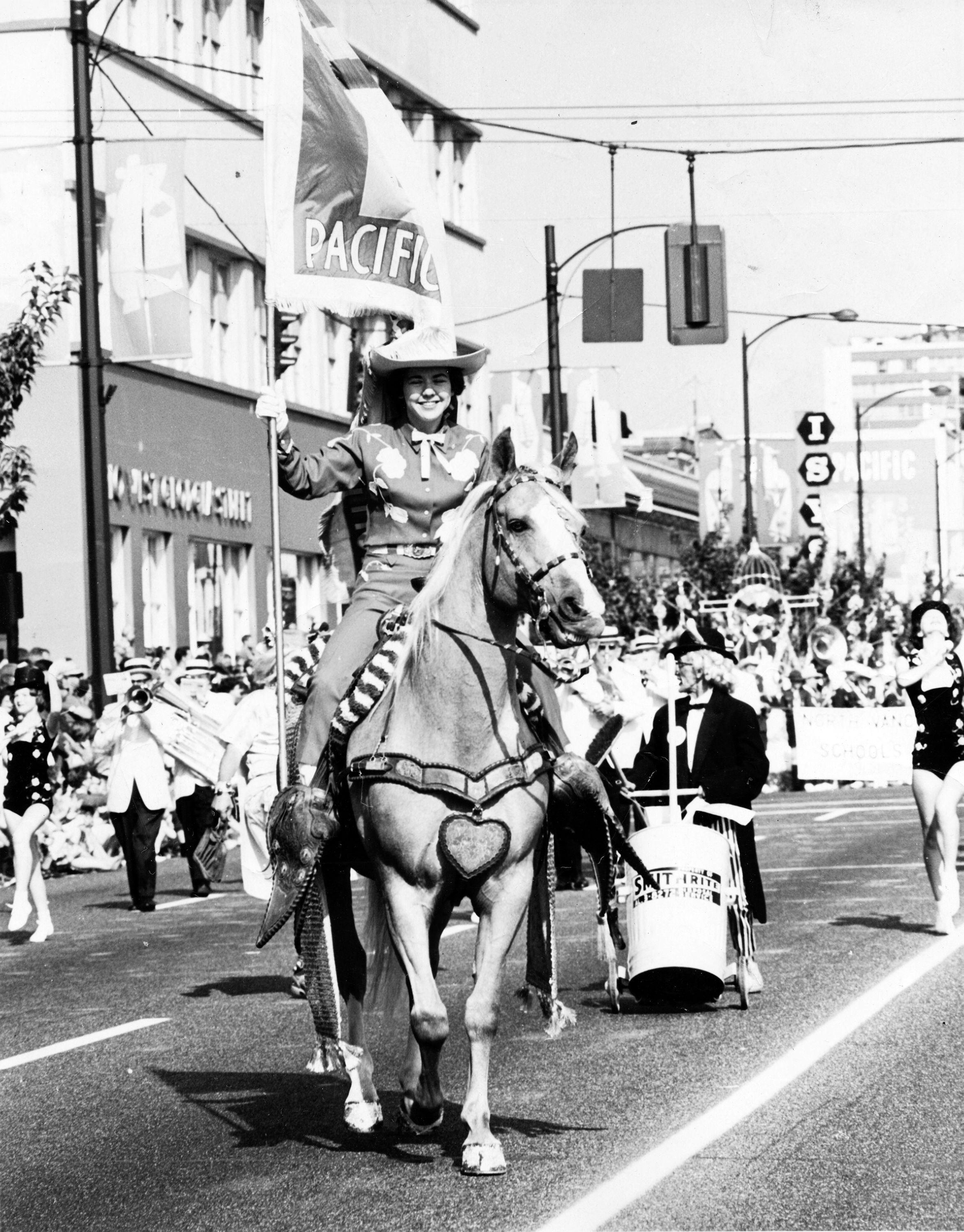 Sharon Hogan on horse in PNE parade, 1969.tif
