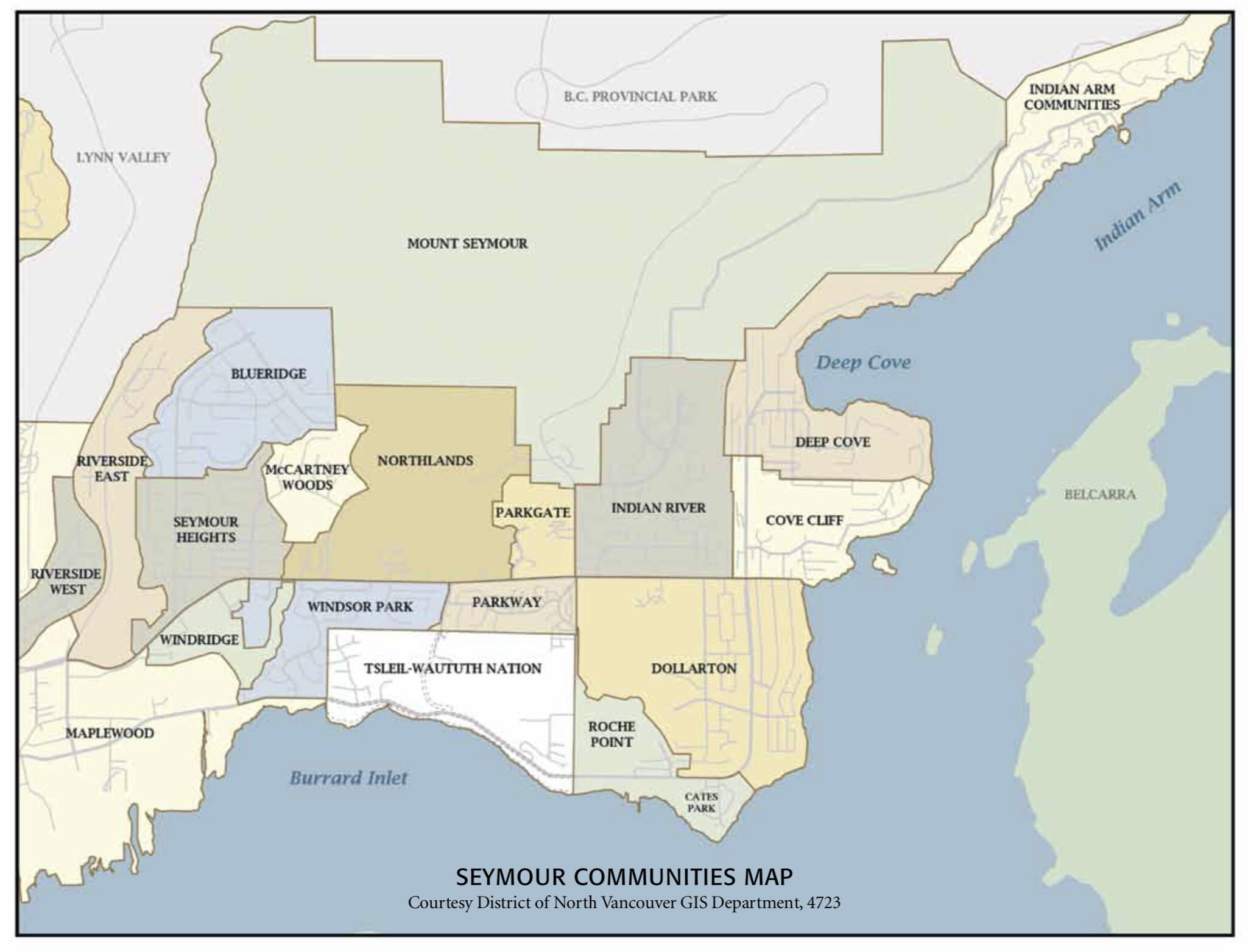 A map of the communities or neighbourhoods within the Seymour area of North Vancouver, B.C. Canada. They area is often