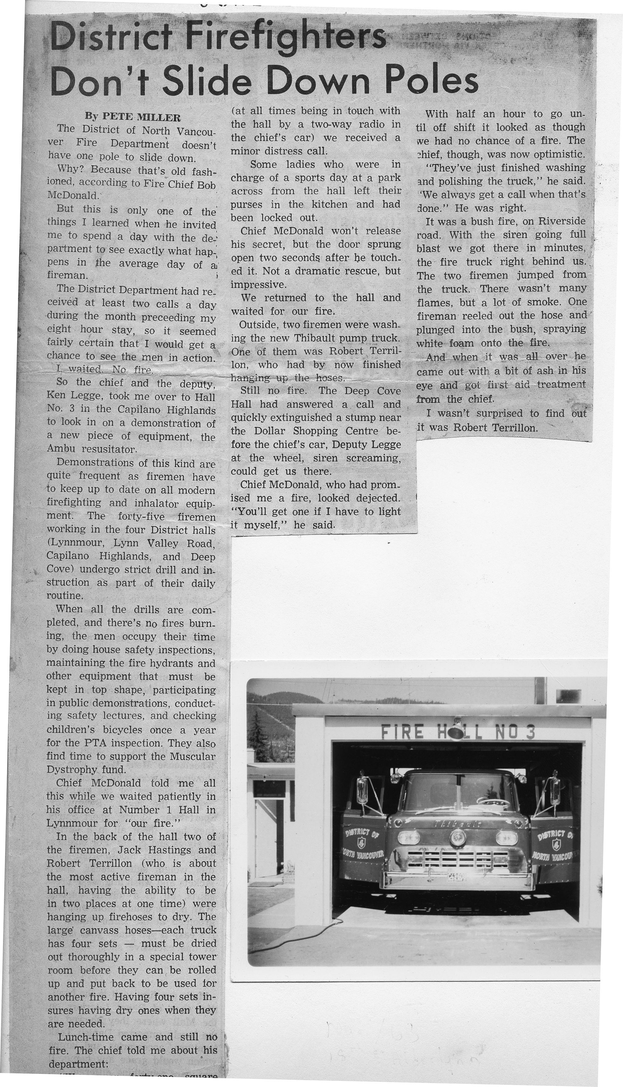 "District Firemen don't slide down poles" - news story about District of North Vancouver Fire Department