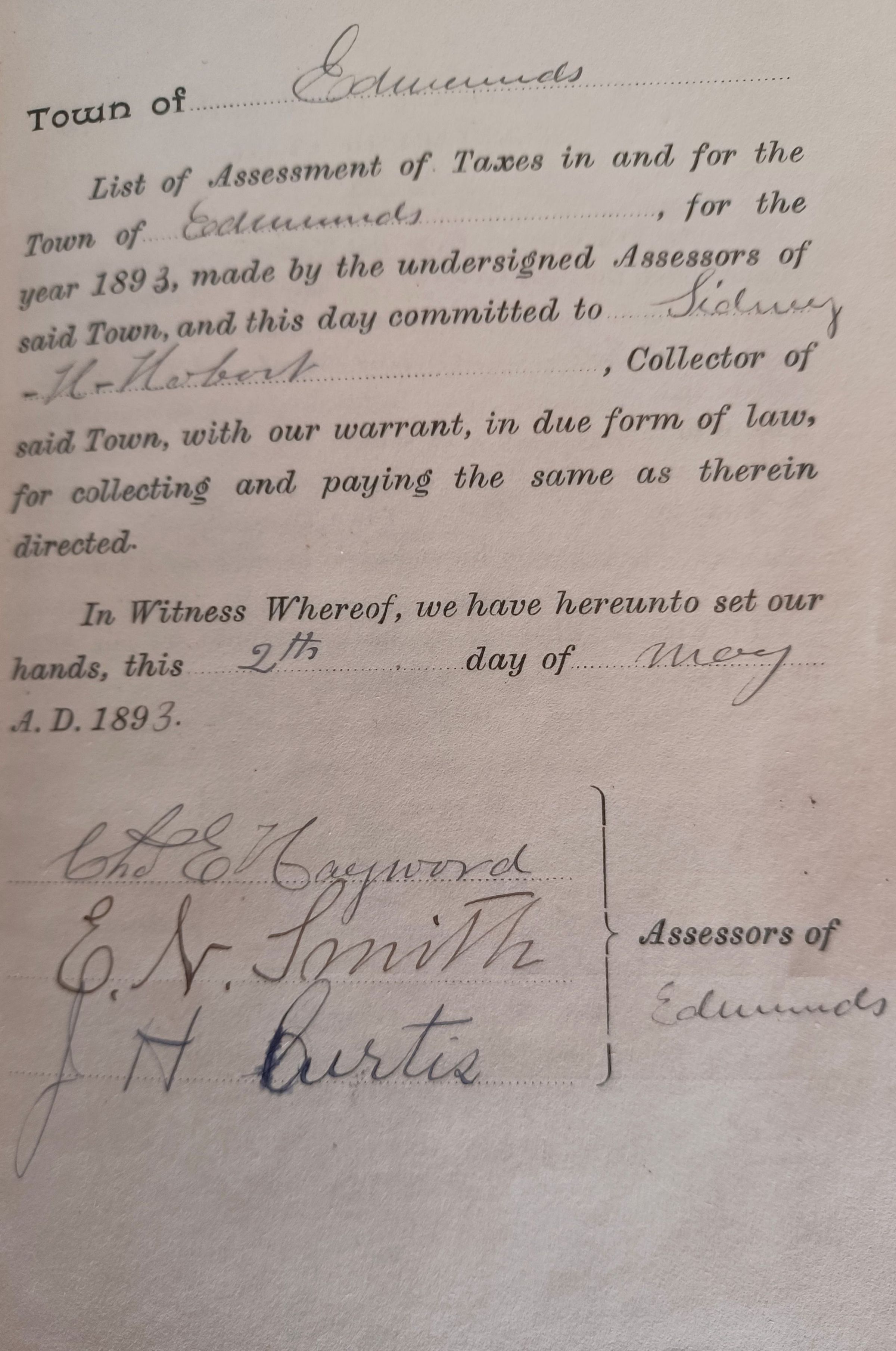 "List of Assessment of Taxes in and for the Town of Edmunds, for the year 1893, made by the undersigned Assessors of the said Town..."Context