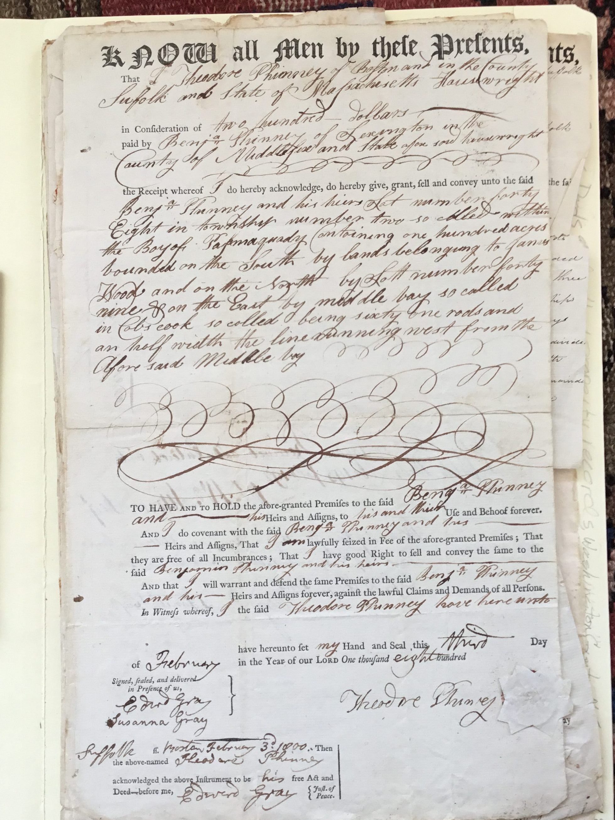 Includes approximately 25 manuscript deeds to property in Washington County. Also includes unknown surveyor's notebook recording survey details of Township 14, now Cathance Township. Also includes one blank deed form, circa 1840.Collection