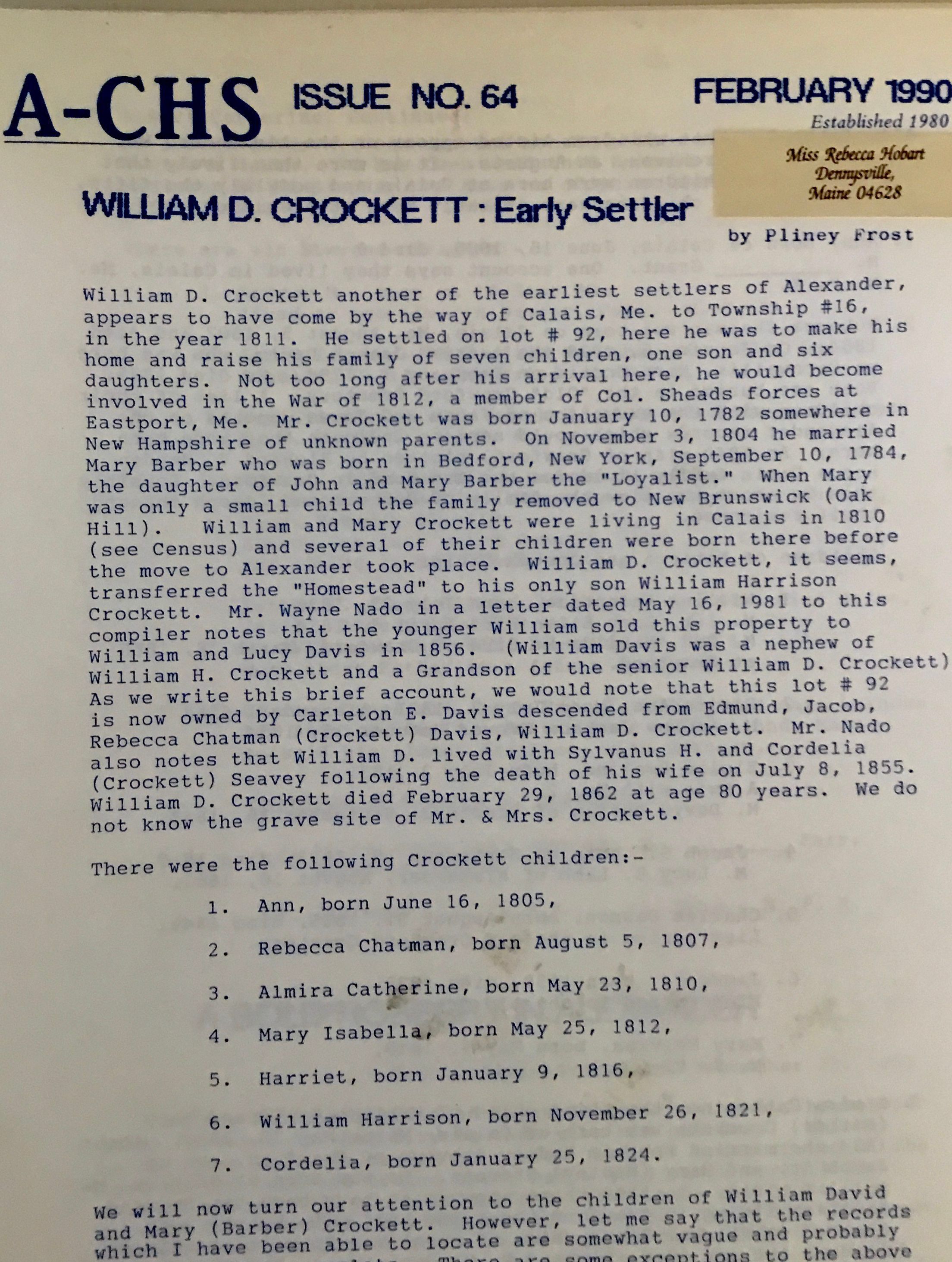 Crawford, Maine---History, Alexander, Maine--HistoryPublication Details