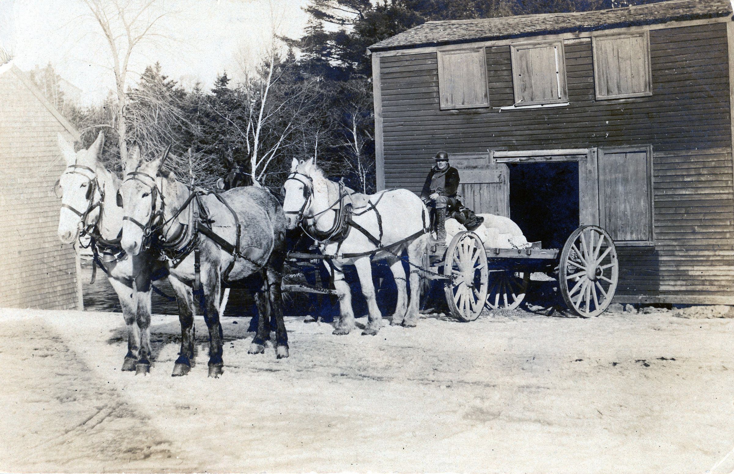 Hay scales were built near Gardner's Store in 1892. Granite was brought from Red Beach by the Charlie Ross for the foundation, supplemented by rocks from Bela Anthony's place. At about five year intervals, the scales required repairs, sometimes on the wall, but more often on the frame and platform Some of the repairmen were Ned Sheahan, James Robinson, Stephen Dudley, Isaac and Ross Wilder, and Willis Leighton. In 1924 the Pushee Brothers put a new frame around the scales, and in 1930 Mel Hayward made the last recorded repairs on them. Evidence of the Red Beach granite is still on the site.