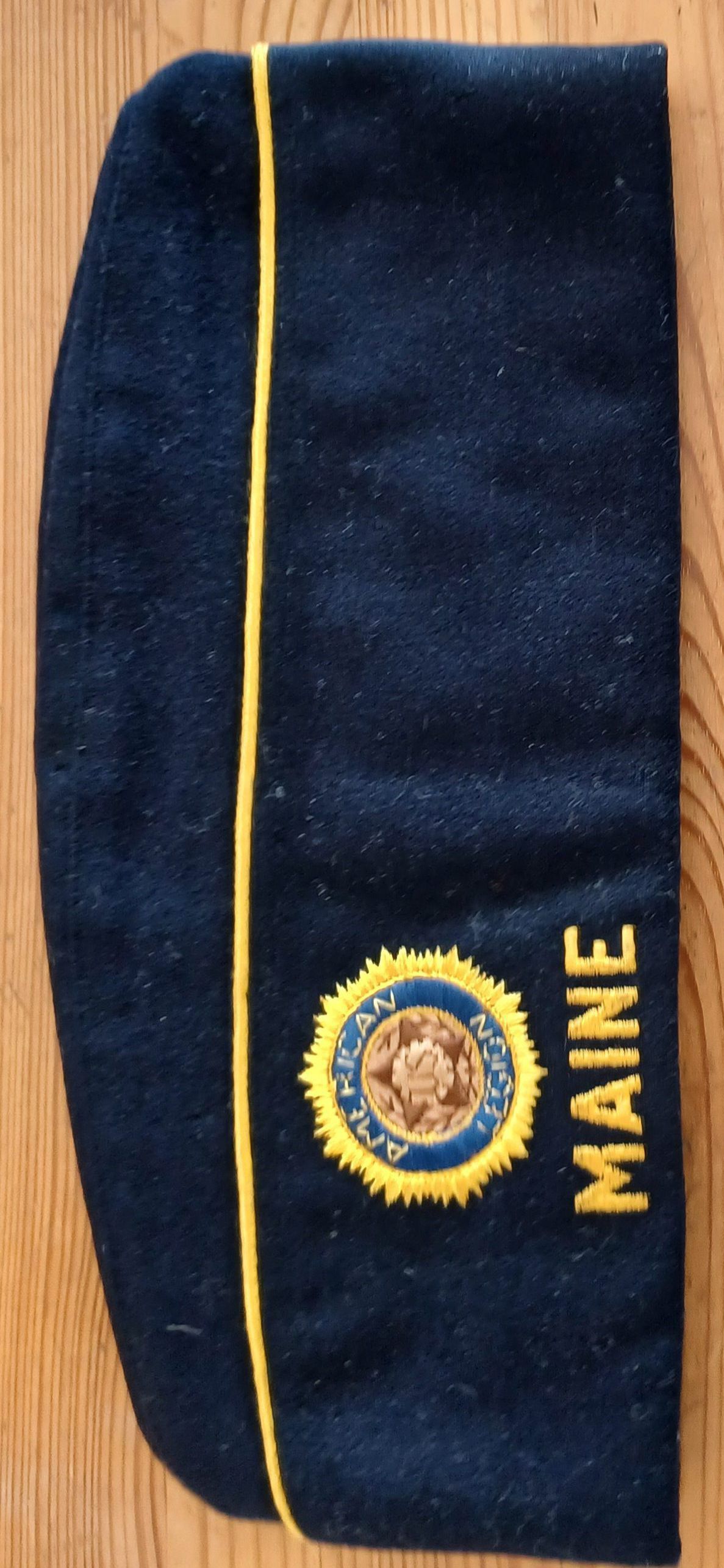 An American Legion cloth cap with the insignia "Maine" and "59" embroidered on the front and back.