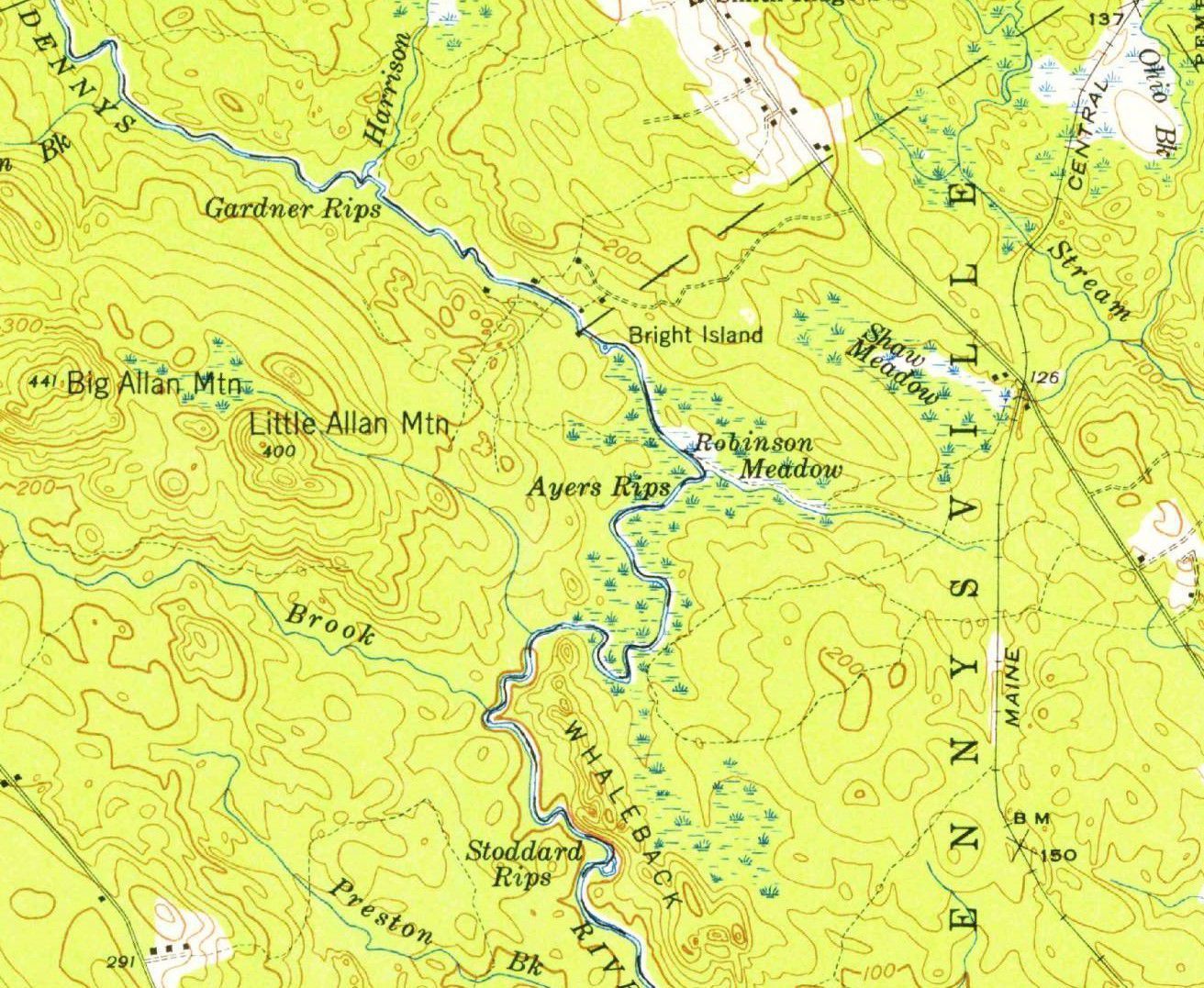 Class I-II rapids beginning just above the confluence with Robinson's Meadow flowage and running about a mile down the Dennys River.Collection