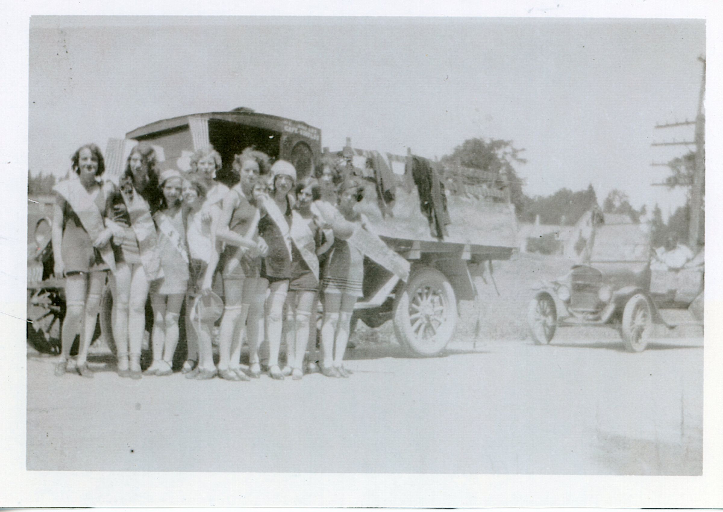 Young women wearing swimming costumes and sashes at a parade, ca. 1925.