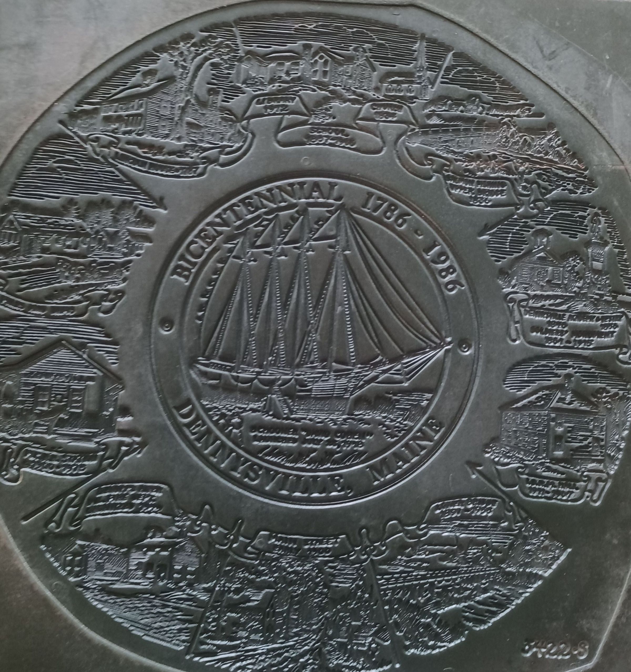 A plate used to print the decorative seal used in material distributed for the 200th anniversary of the founding of Dennysville, Maine, by the Dennys River Historical Society (DRHS).