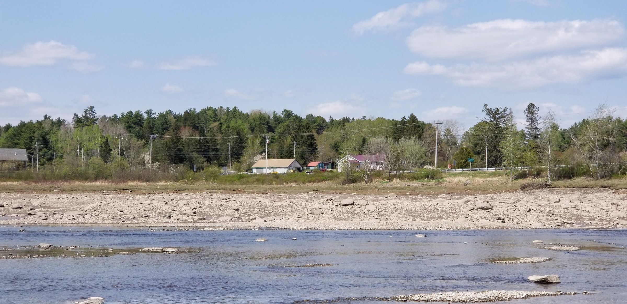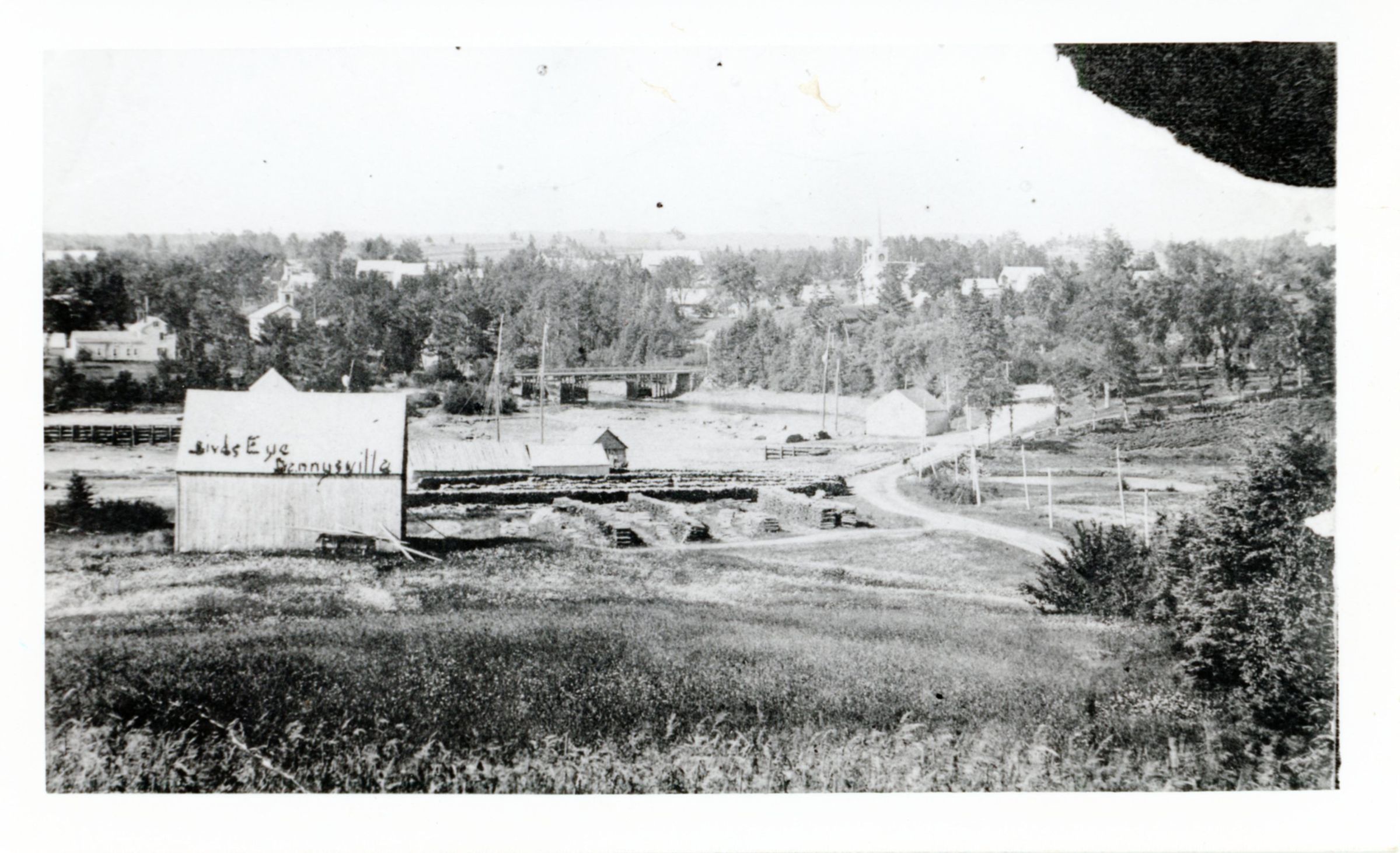 Lumber is stacked and drying beside a shingle mill on the hillside above the Packet Wharf, while the Lincoln's wharf and storehouse can be seen on the other side of dock bridge on the right hand side of the image. Viewed at low tide, the Lower Bridge crosses the river to Edmunds, with the Aaron Hobart House and T.W. Allan's wharf visible on the left.