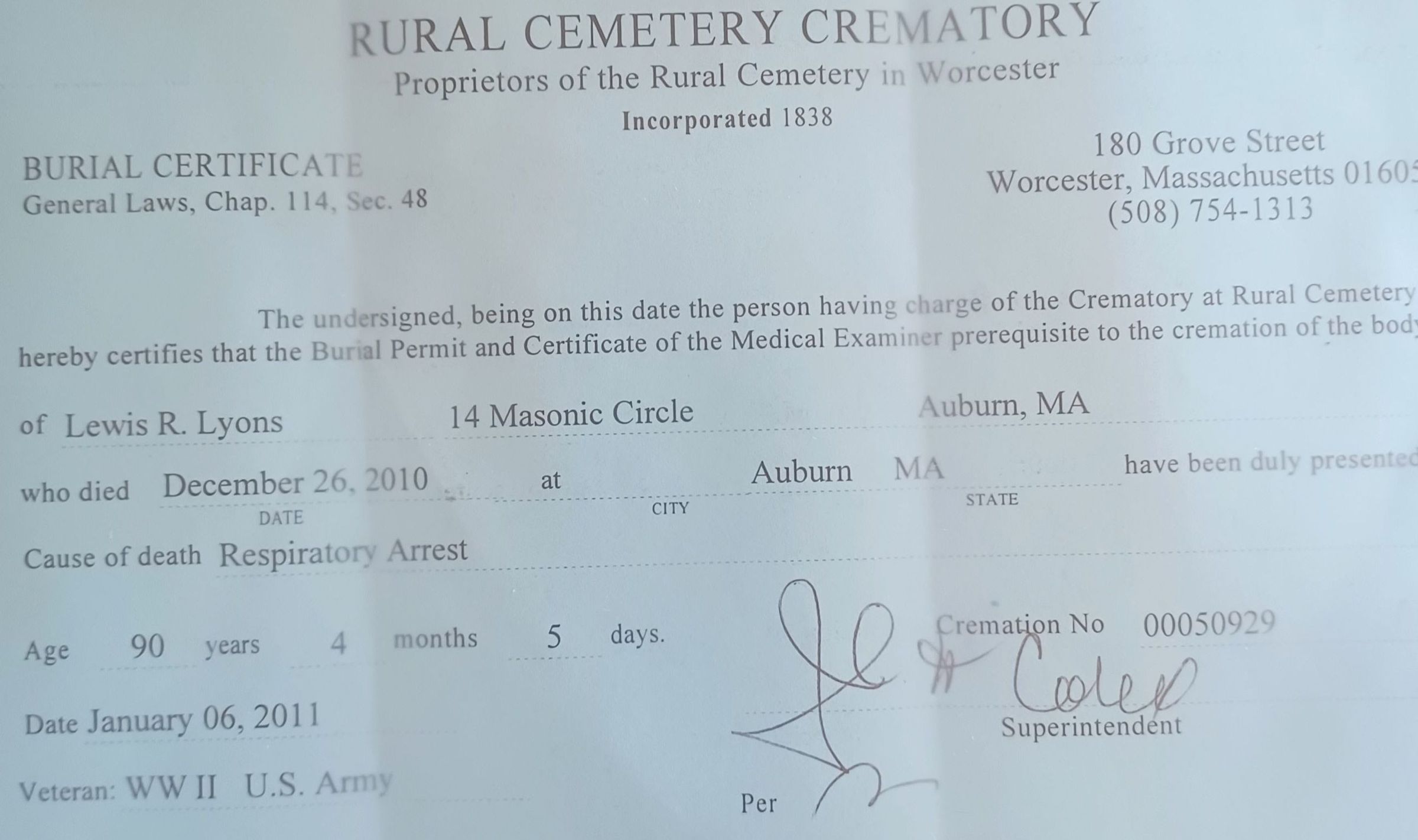 Contains three items: burial certificate, transportation permit (copy), and envelope, authorizing the transportation of the cremains of Louis R. Lyons, who lived in Auburn, Massachusetts at the time of his death in 2011.Context