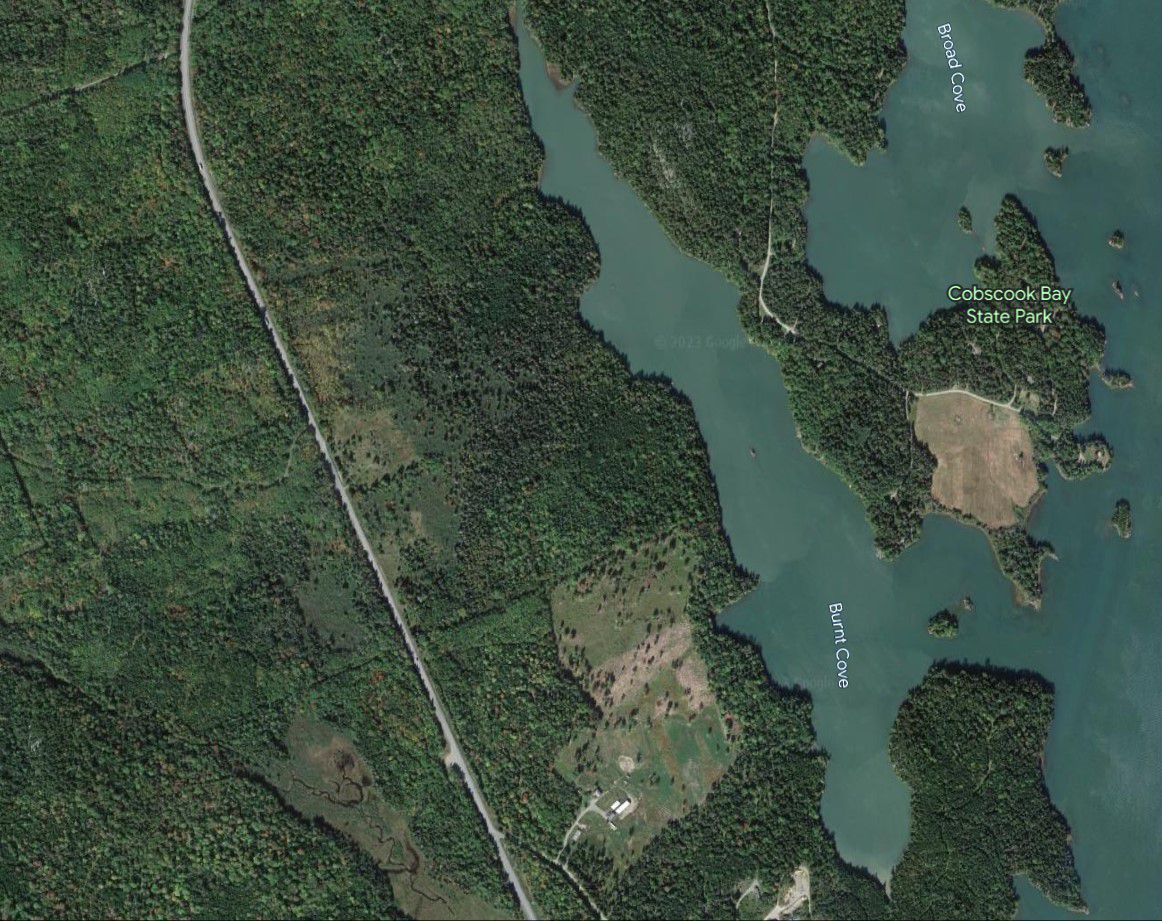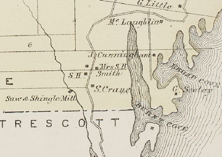 Detail of map of south Edmunds in 1881, showing the structures and their occupants around Burnt Cove, including the School House, and a Saw and shingle Mill on Crane Mill Brook. Note that the boundary with Trescott was later moved to incorporate the land belonging to the Bell farm and tide mill at the southern end of Crane Mill Brook.Collection