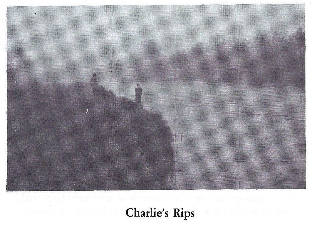 Charlie's Rips on the Dennys River, and map, reproduced from "Salmon on the Dennys, 1786-1988", by Ed Bartlett and Ray Robinson. Named after Charlie Sylvia, the principal teacher at the Edmunds Consolidated School and resident of Harrison Road, he would cross the fields to this favorite fishing spot on the banks of the Dennys River.Context