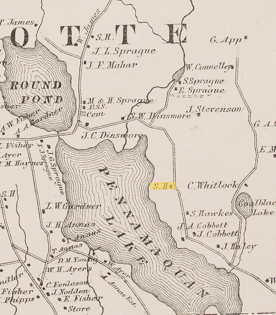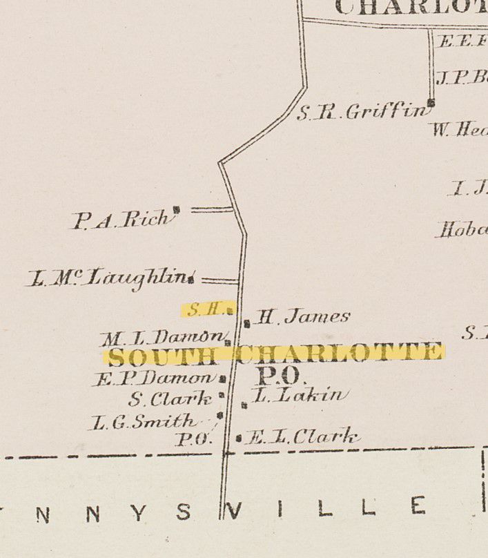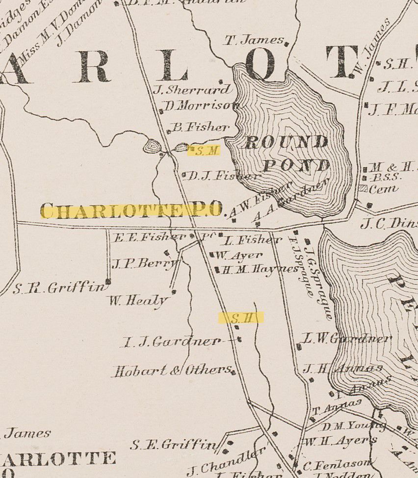 A cadastral view showing individual property owners and civic structures located in the town of Charlotte, Maine, in 1881. Highlights mark up the two Post Offices, school houses and a sawmill. The South Charlotte district Post Office and school house are on the Smith Ridge Road, just across the town line from Dennysville.Collection