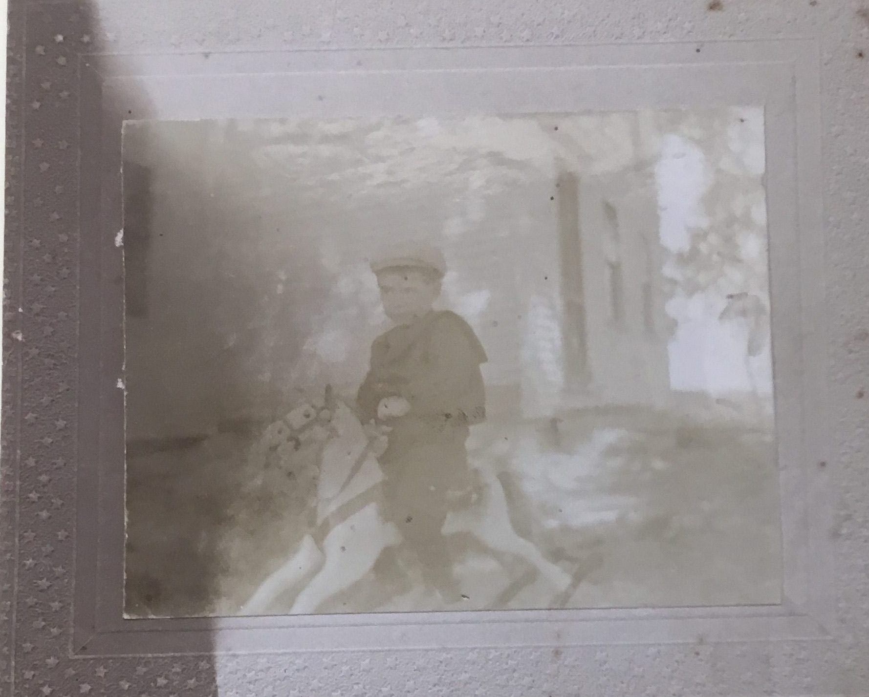 Two matted photographic prints showing Robert F. Wilder as a young child. One shows the child on a rocking horse, the other shows him standing before a fence.Collection