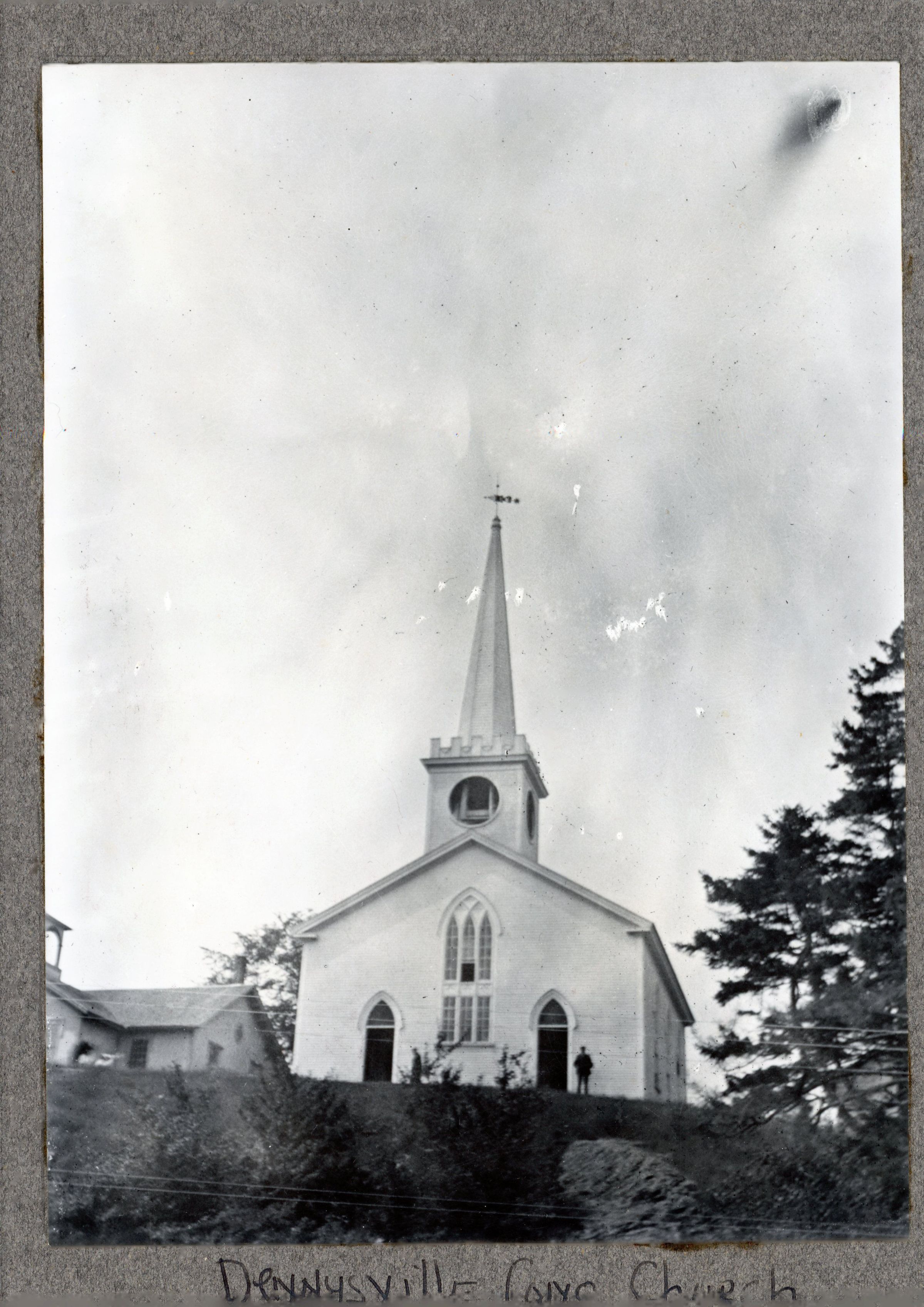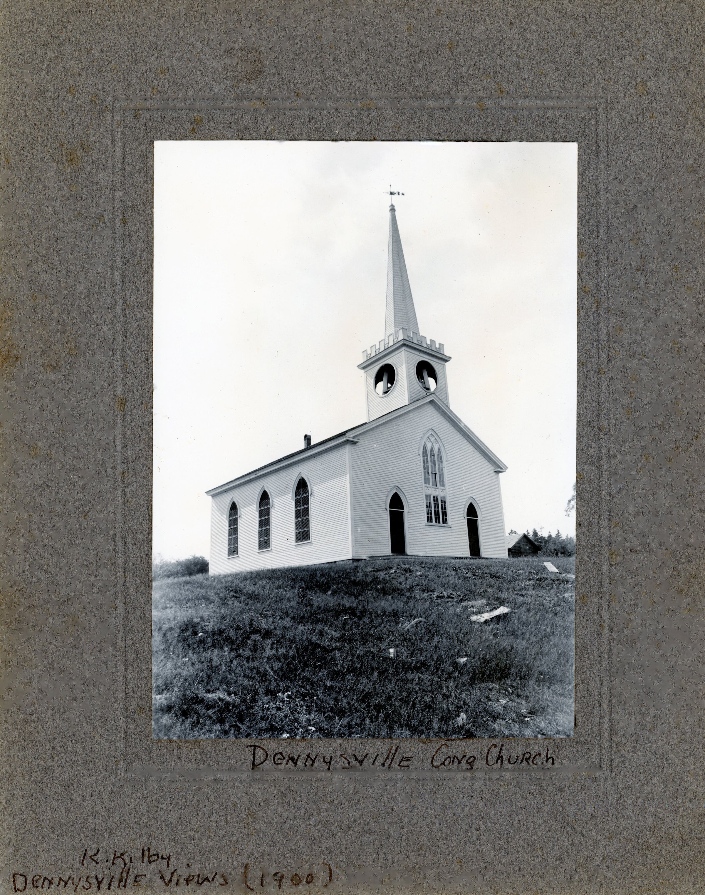 Congregational Church building, Dennysville, Maine from the John Sheahan Collection c. 1880's. The louvers had yet to be added to the base of the steeple. The carriage shed is shown at the right of the church building.Context