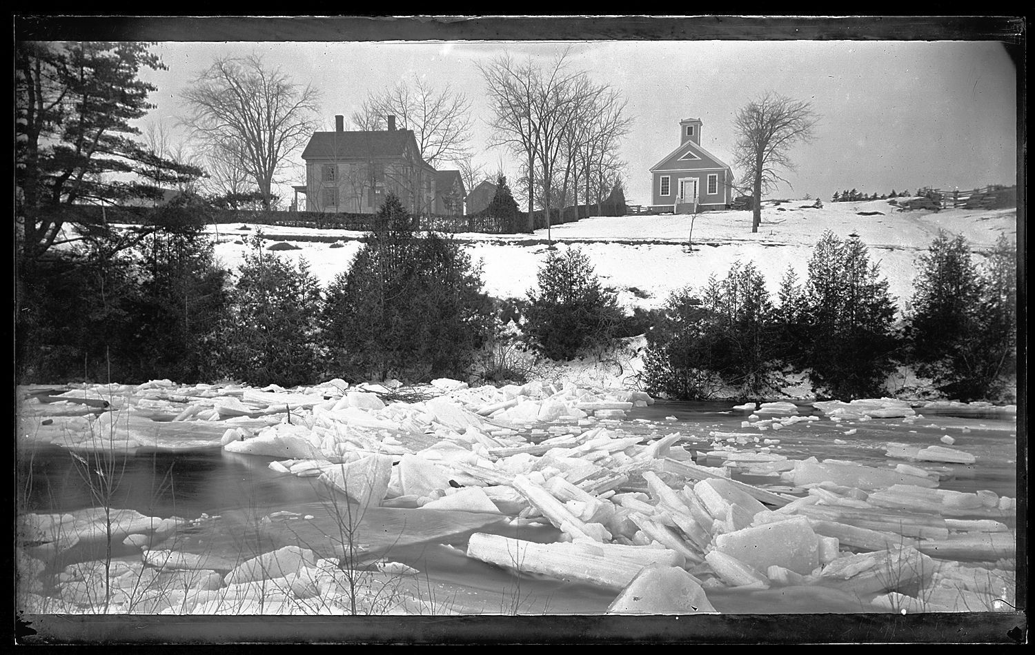 The image of an ice jam in the Dennys River shows the Congregational Parsonage to the left of the Vestry, formerly the Dennysville Academy, in this photograph by John P. Sheahan taken during the1880's. It is now the Academy/Vestry Museum of the Dennys River Historical Society.Context