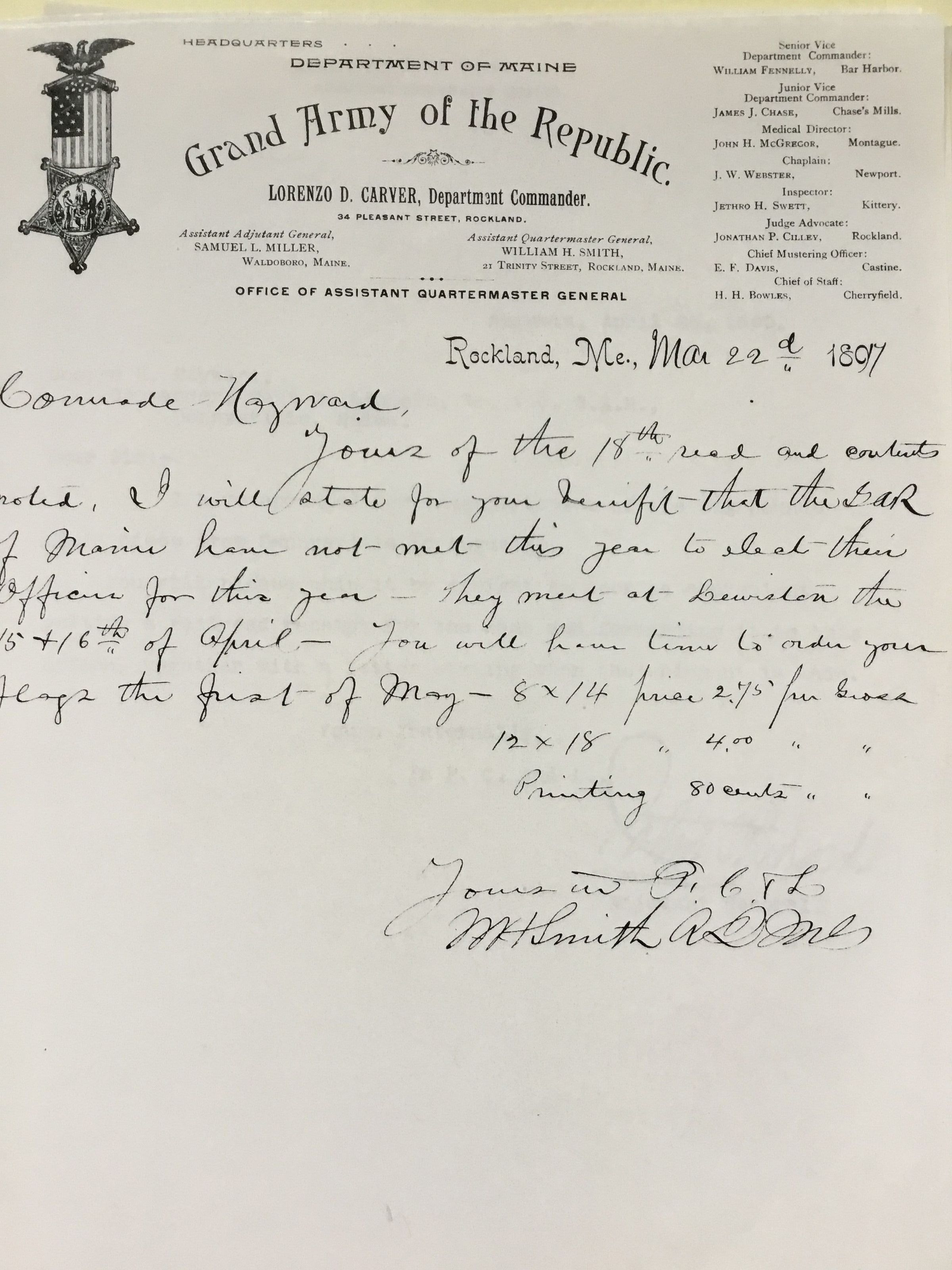 Copies of correspondence related to the shipment of a cannon to Maine G. A. R. headquarters in Augusta.Collection