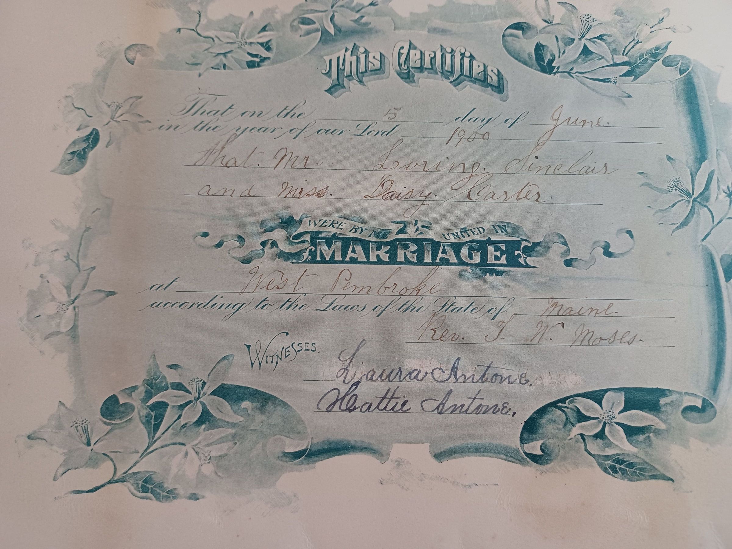 Loring Sinclair and Daisy Carter were married in West Pembroke, Maine June 15, 1900.