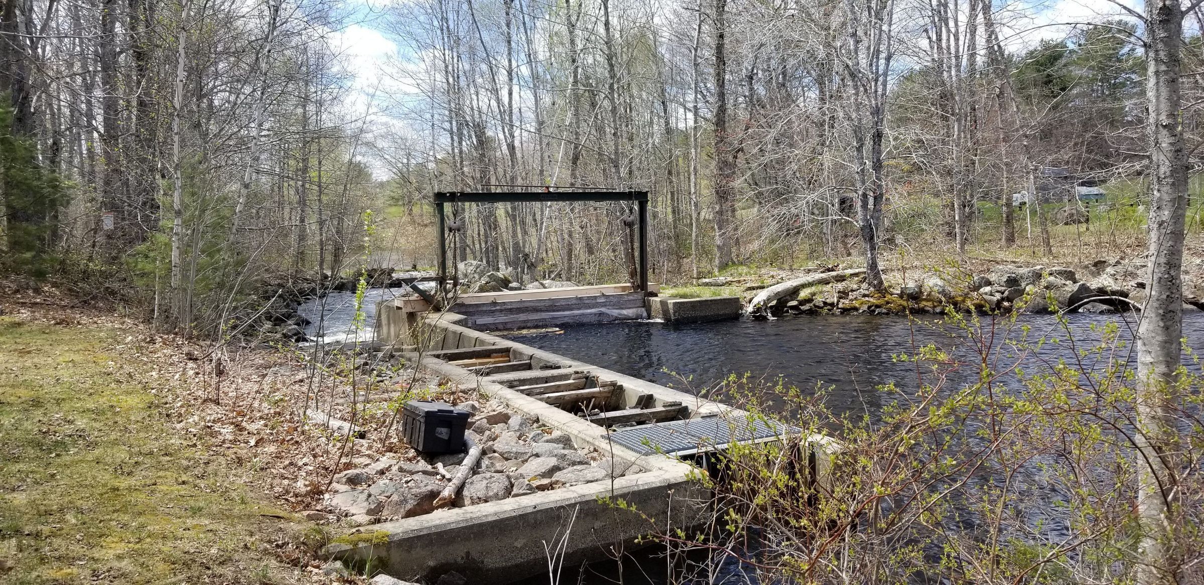 View of the fish ladder beside the dam on Meddybemps Lake during alewife run on the Dennys River in early May, 2023. "Meddybemps" is the Passamaquoddy word for "plenty of alewives."Collection