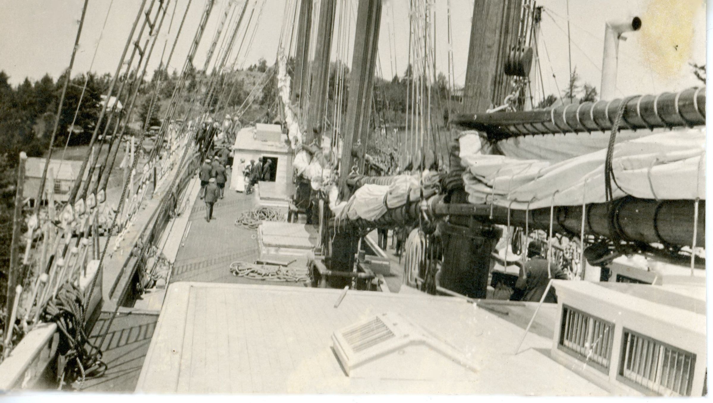 Four masts and rigging are clearly visible beyond the deck house on the David Cohen, which was being prepared for launch at the Pushee Brother's shipyard in Dennysville, Maine on July, 1918.Collection