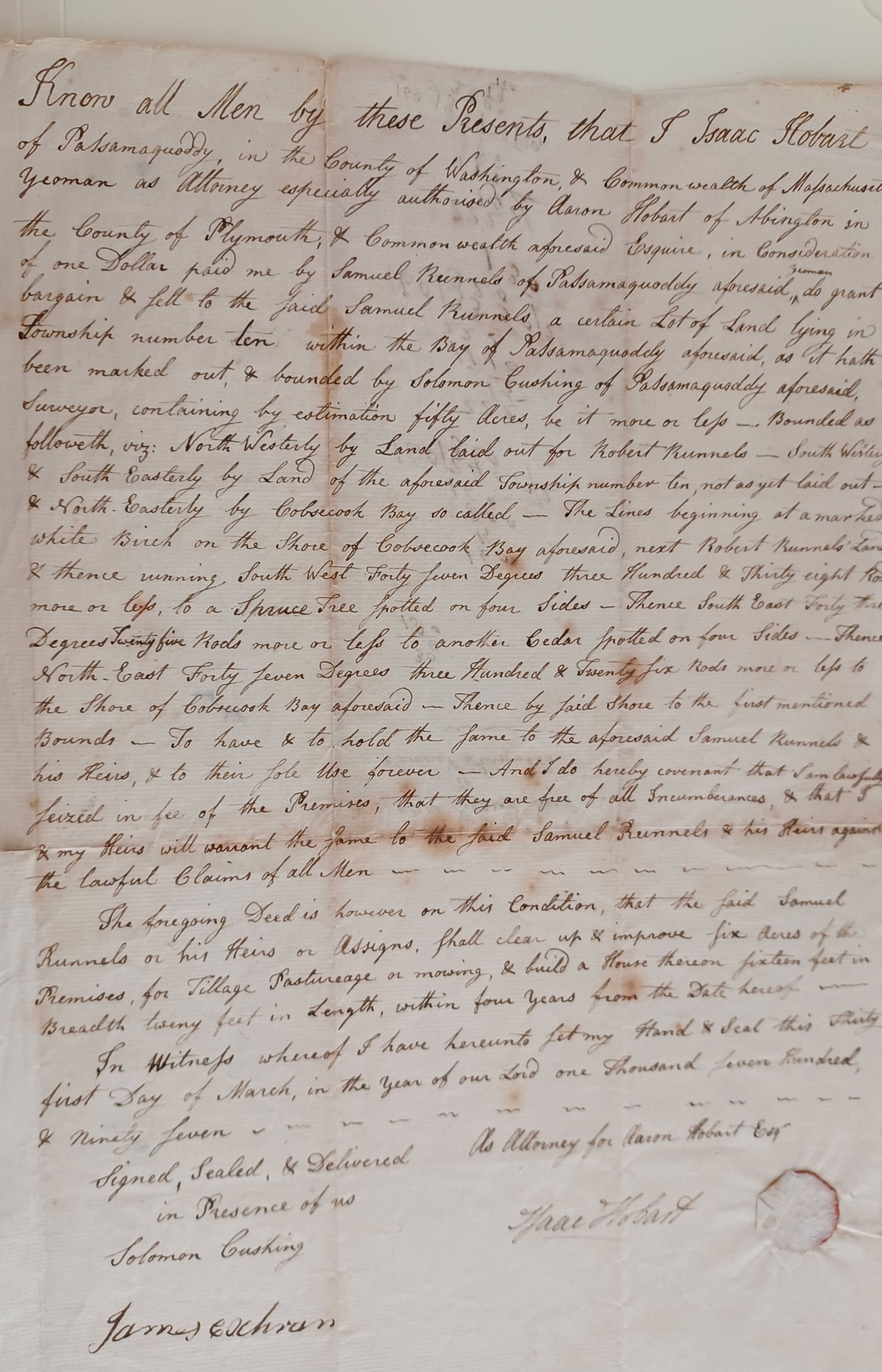 Deed conveying approximately 50 acres from Aaron Hobart to Samuel Runnels in Township 10, which became the town of Edmunds. Signed by Solomon Cushing; the surveyor of the land; Isaac Hobart, attorney for Aaron Hobart; and James Cochran.