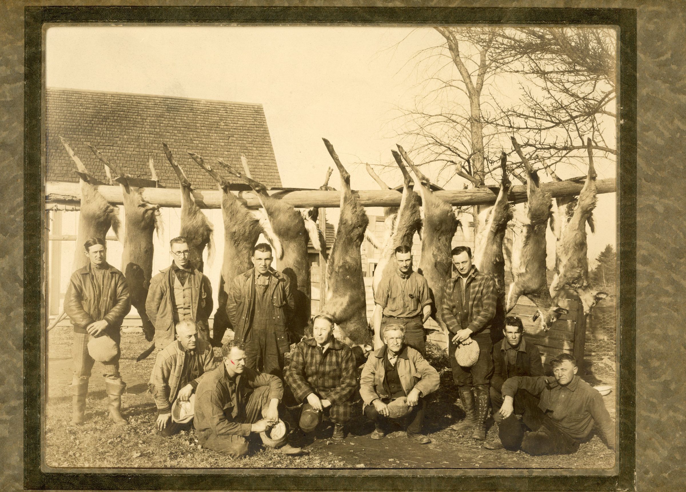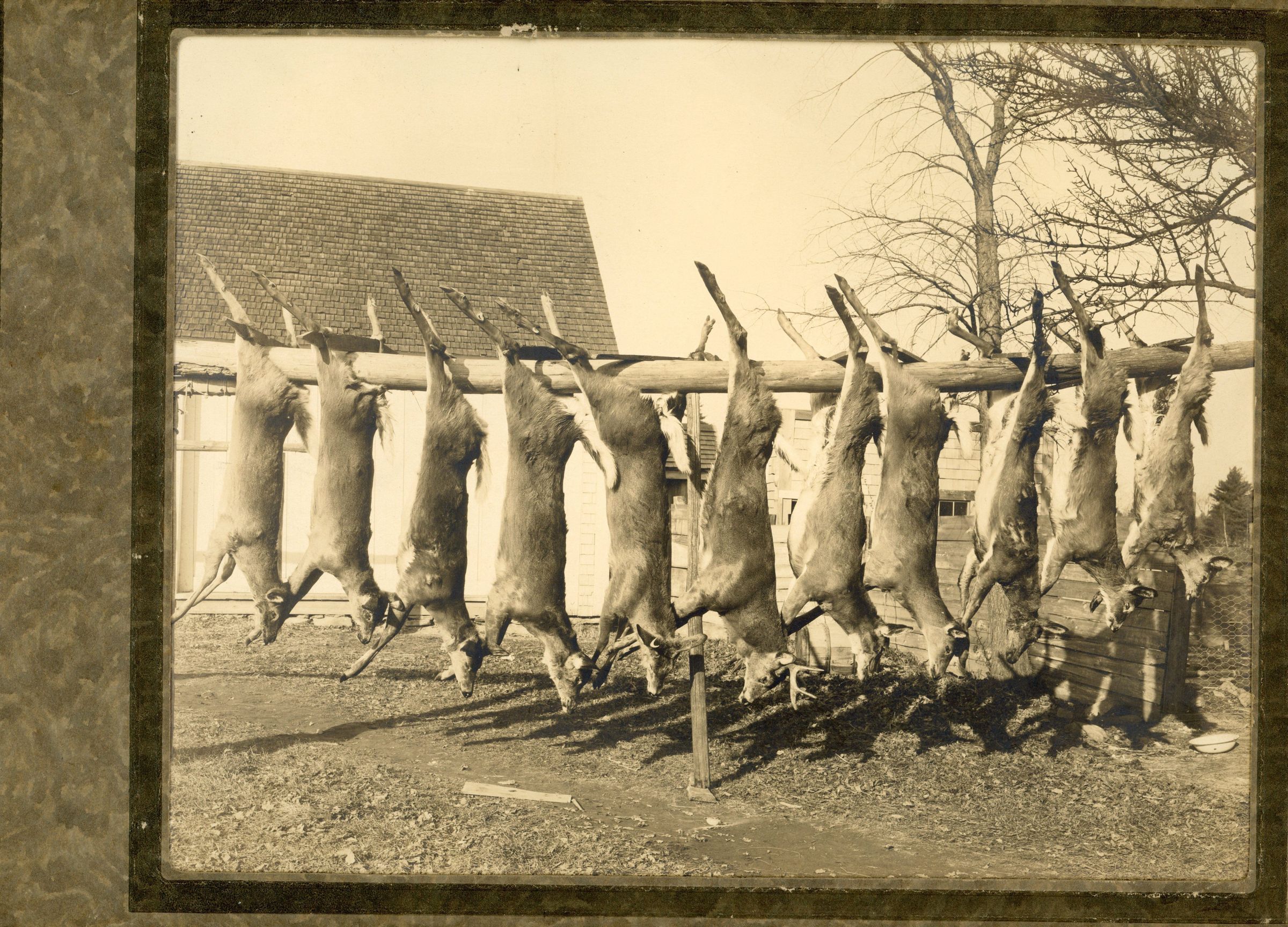 Views of hunting camps and Deer harvested on the Dennys River. Location and names of hunters are unknown. Scenes like this were common during hunting season among those who came to the area to hunt birds, deer, and other game each fall.Photograph Details