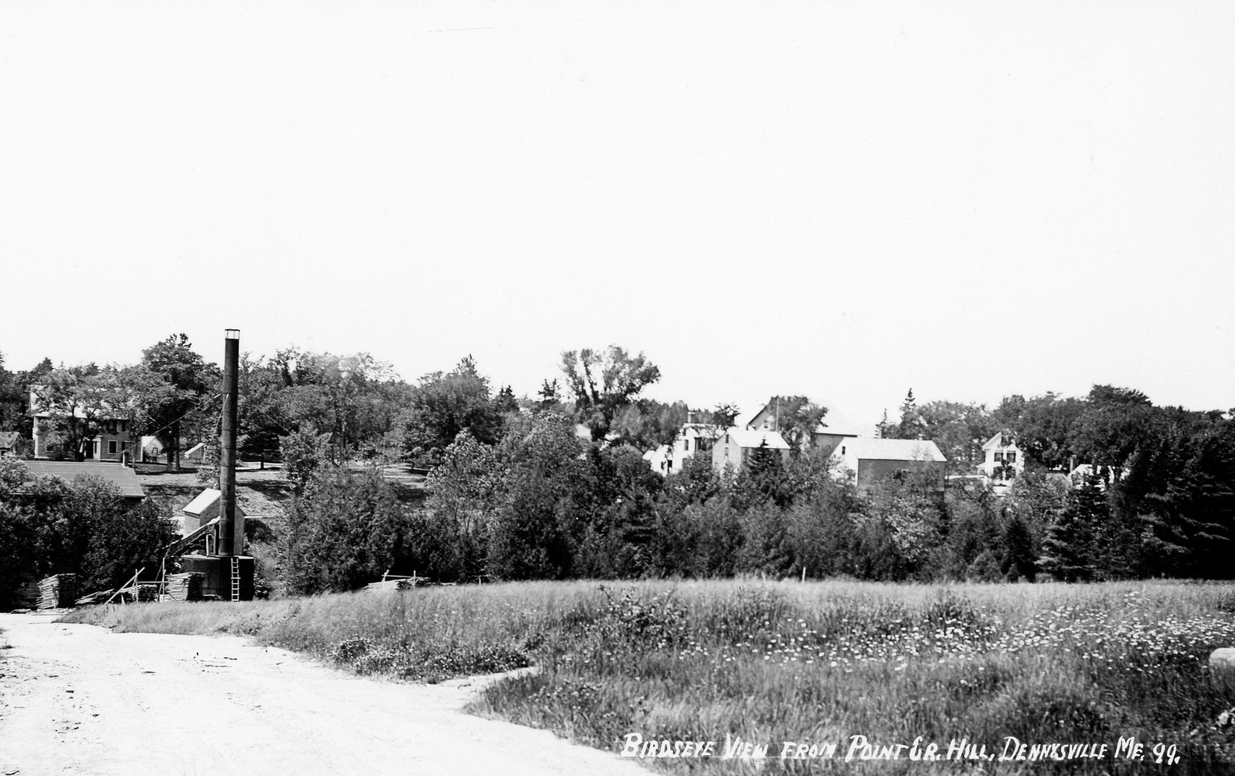 Views both downstream and upstream from the Upper Bridge over the Dennys River. A postcard image from the Bunker Hill Road overlooking the downstream portion of the river shows the mills and houses once located there.Collection