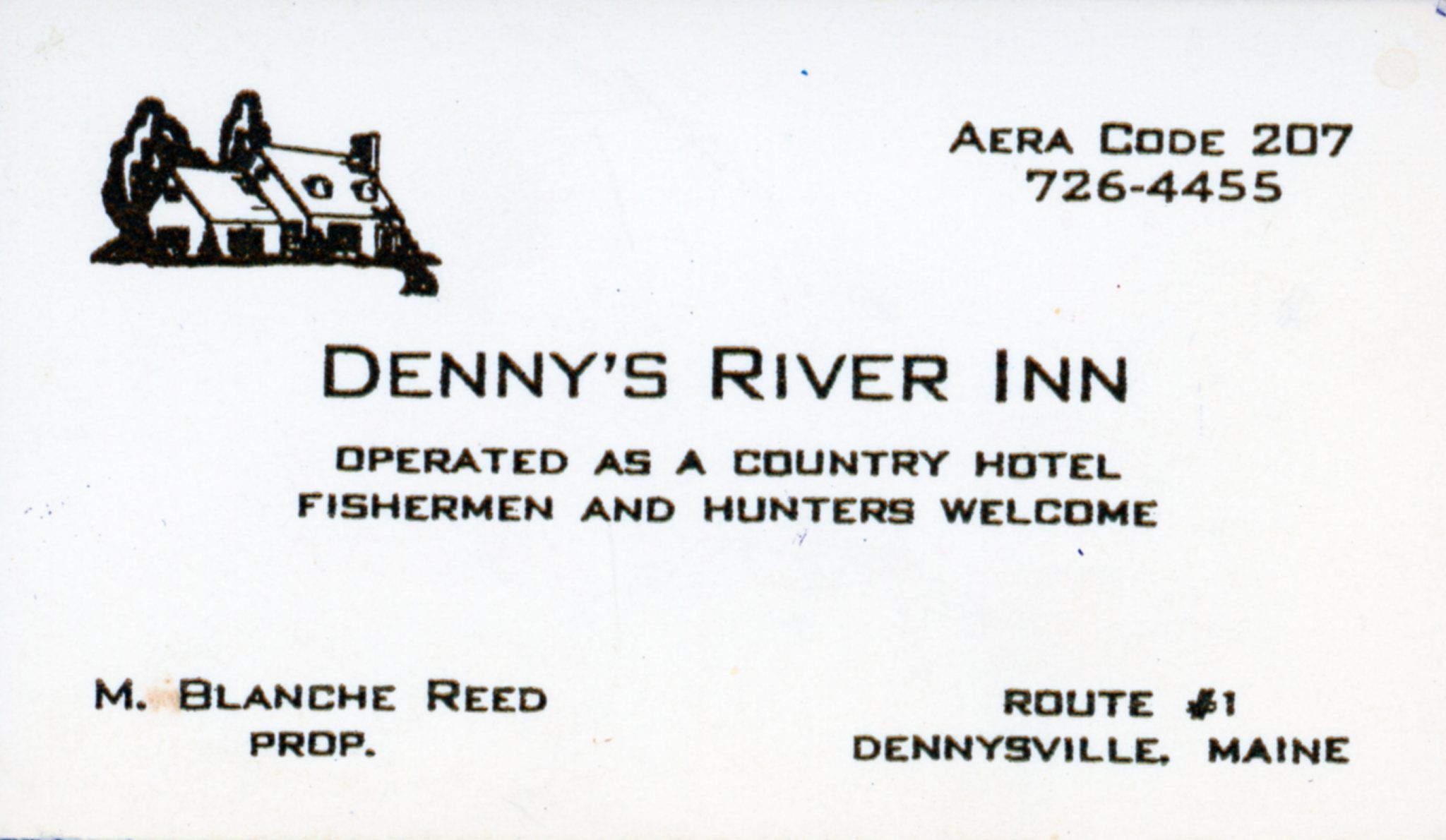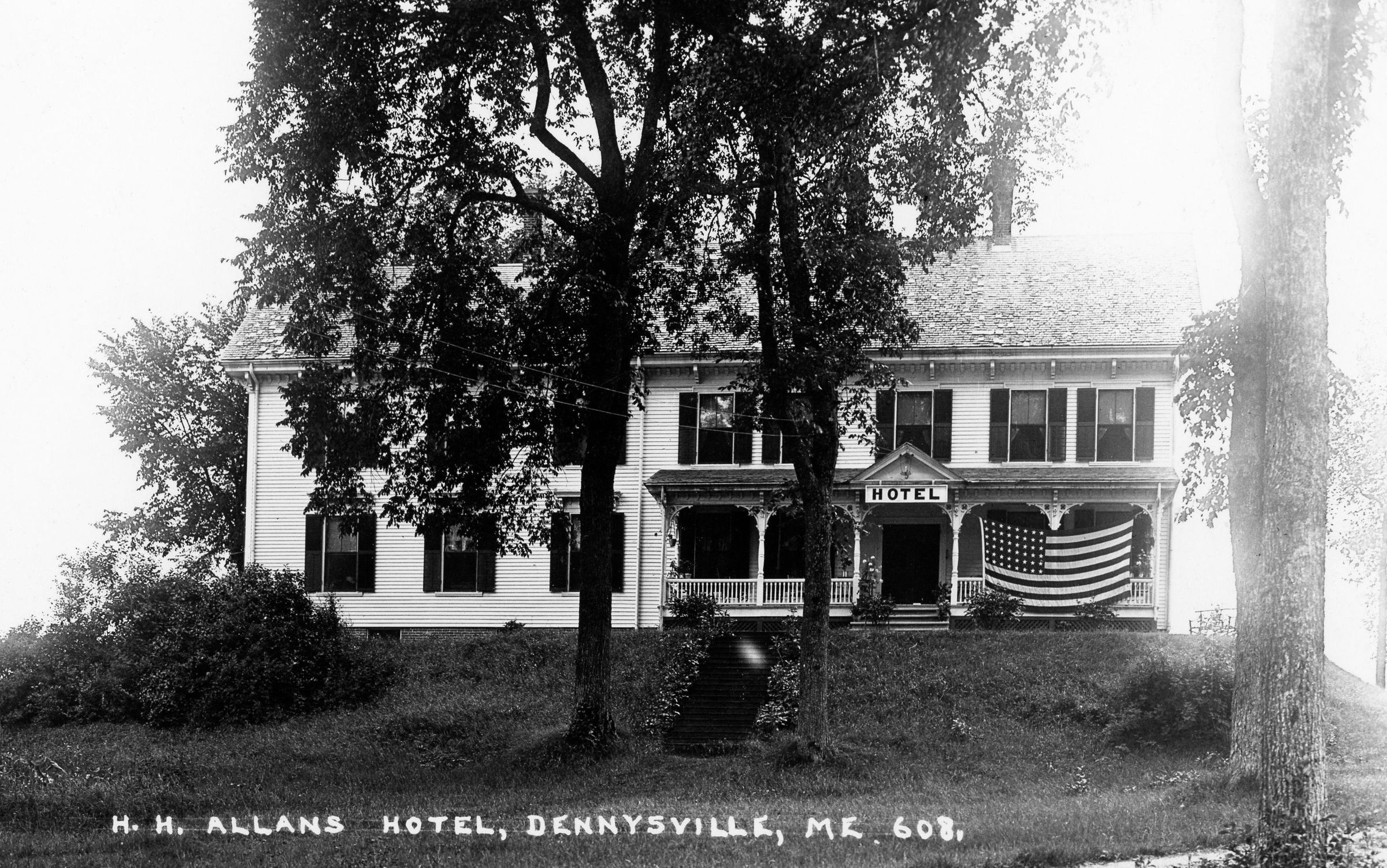 Capt. Ebenezer C. Wilder built a small dwelling on his property on The Lane. In 1834 he added a two-story house to the original structure. He and his wife Abigail (Ayer) then opened "Wilder's Hotel" which, according to the swinging sign, offered shelter and food to wayfarer's and weary beasts under the roofs of their houses and barn. In those days the drovers who travelled through the country with large herds of cattle "from the Kennebec," were lodgers at hostelries such as Wilders'. IN later years the hotel was operated by George W. Wilder, the youngest son of the family, who conducted the affairs so as to gain the favor of patrons of the house. Elijah A. Wilder succeeded his brother as proprietor a few years before the property was purchased in 1865 by John D. Allan. The building then became "Allan's Hotel" and continued to provide the public fine meal, clean, soft beds, and attentive service. On August 3, 1875, President Ulysses S. Grant was a guest at Allan's Hotel, accompanied by General Hastings of Washington and G.T. Granger of Calais. The surprising fact is there their bill, including the fee for the care of their two horse, was charged! Allan's Hotel also served as the site of the County Republican Conventions during the years when delegates arrived by horse and buggy. Mr. Allan conducted the business about twenty-five years, closing in 1890. In 1896 J.D. Allan tore down the original E.C. wilder house and removed the two-story section, which later became Howard Laughton's barber shop. He then had a handsome, two-story residence built by Nathan Foster, who also built the Pomeroy mansion and the Odd Fellows' Hall in Pembroke. The new livery stable provided ample room to accompany the increased number of horses which resulted from heavier traffic. Herbert H. Allan, son of John D. opened the fine home to the public, as "H.H. Allan's Hotel" in 1932, operating it until his death in 1942. Herbert Allan's widow, Eleanor (Sherrard) succeeded him, conducting the business until the property was purchased by Mr., and Mrs. Fred Johnson, Jr., who continued to offer the public service as "Dennys River Inn." Robert and Hyla Godfrey were the next proprietors of the Inn, operating it from 1952 until 1969, and becoming well known for their delicious corn fritters and fine braided rugs. Mrs. Blanche Reed, successor of the Godfreys, was the last to have the stately house opened to the public. After being vacant a number of years, it was sold in 1985 to the Estep family for a private house.Collection
