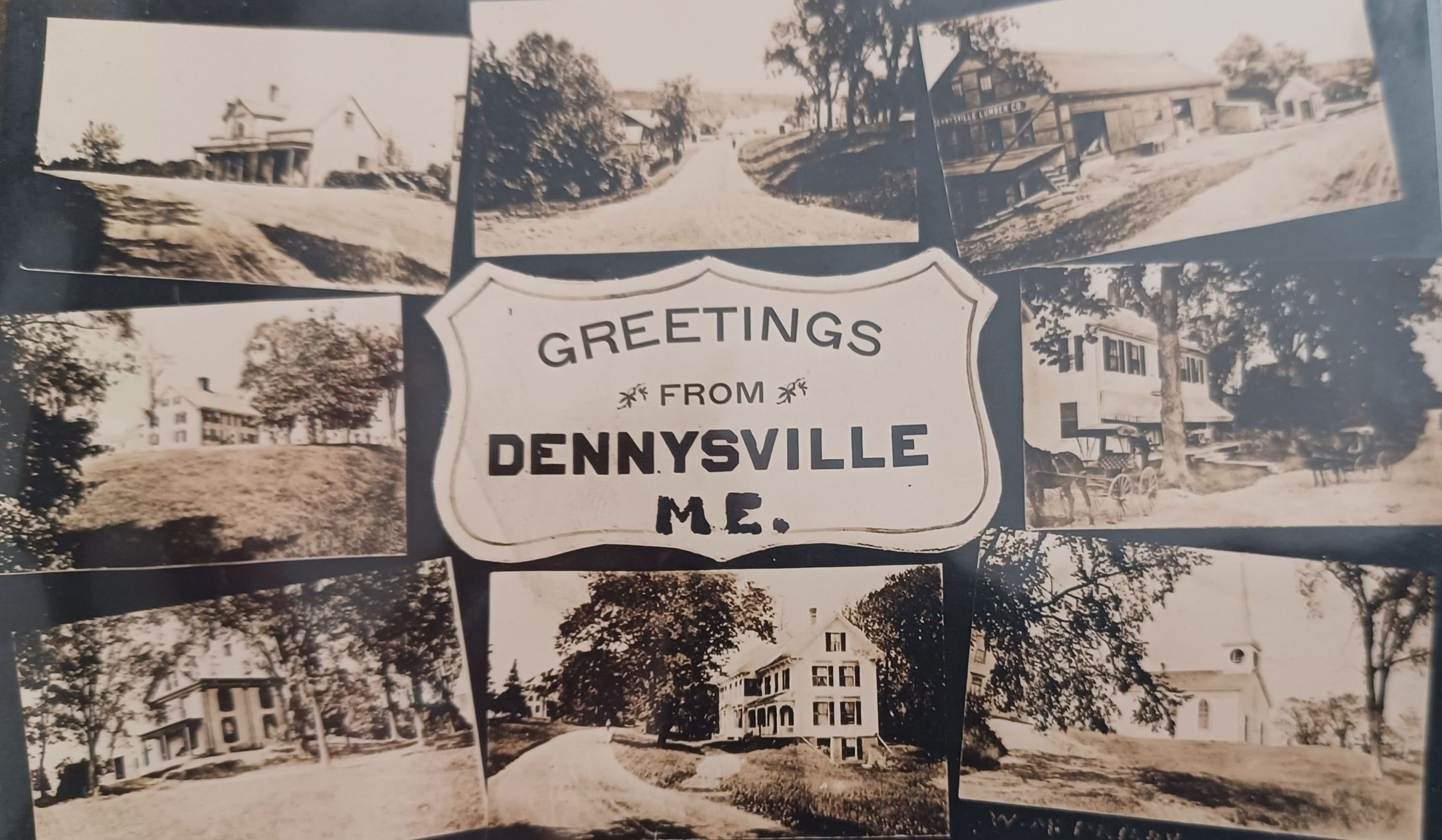 Greetings from Dennysville, Maine (multiple images including Congregational parsonage, Congregational Church, store on Store Hill, hotel, and others)