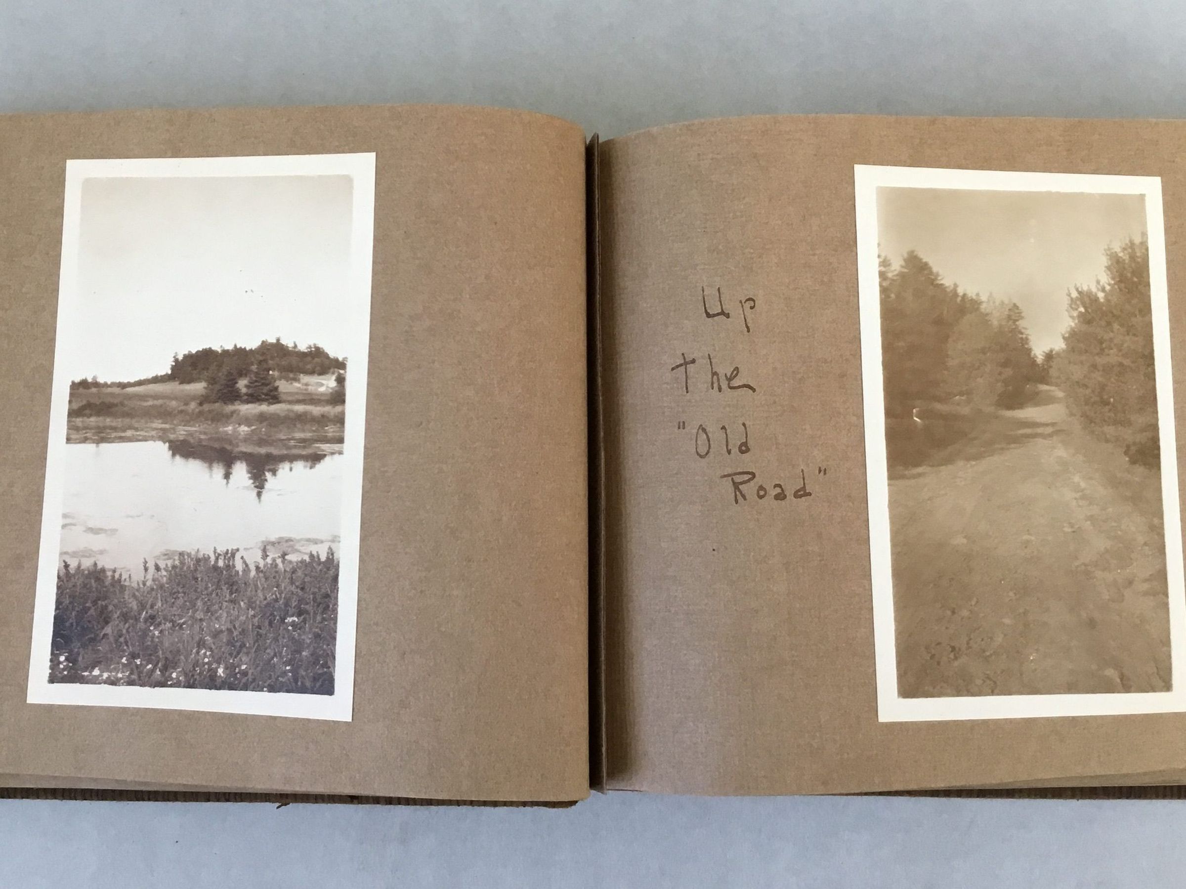 Photograph album of Ruth Lincoln Woodbury that includes images of named structures in Dennysville, including the Kilby House, interior and external scenes of the Dennysville Congregational Church, Dennys River scenes, sunsets, roads, West Quoddy Light, Monhegan Island, Soldier's Monument in Dennysville, haying with cart and horse team, shore and beach scenes, birch trees, and snow scenes. Also included are a typescript of a poem by Mary Vose Sheahan, "Back Home," and a newspaper clipping about the photographer, Ruth Lincoln Woodbury Draper. Most pages also include descriptive quotes.Collection