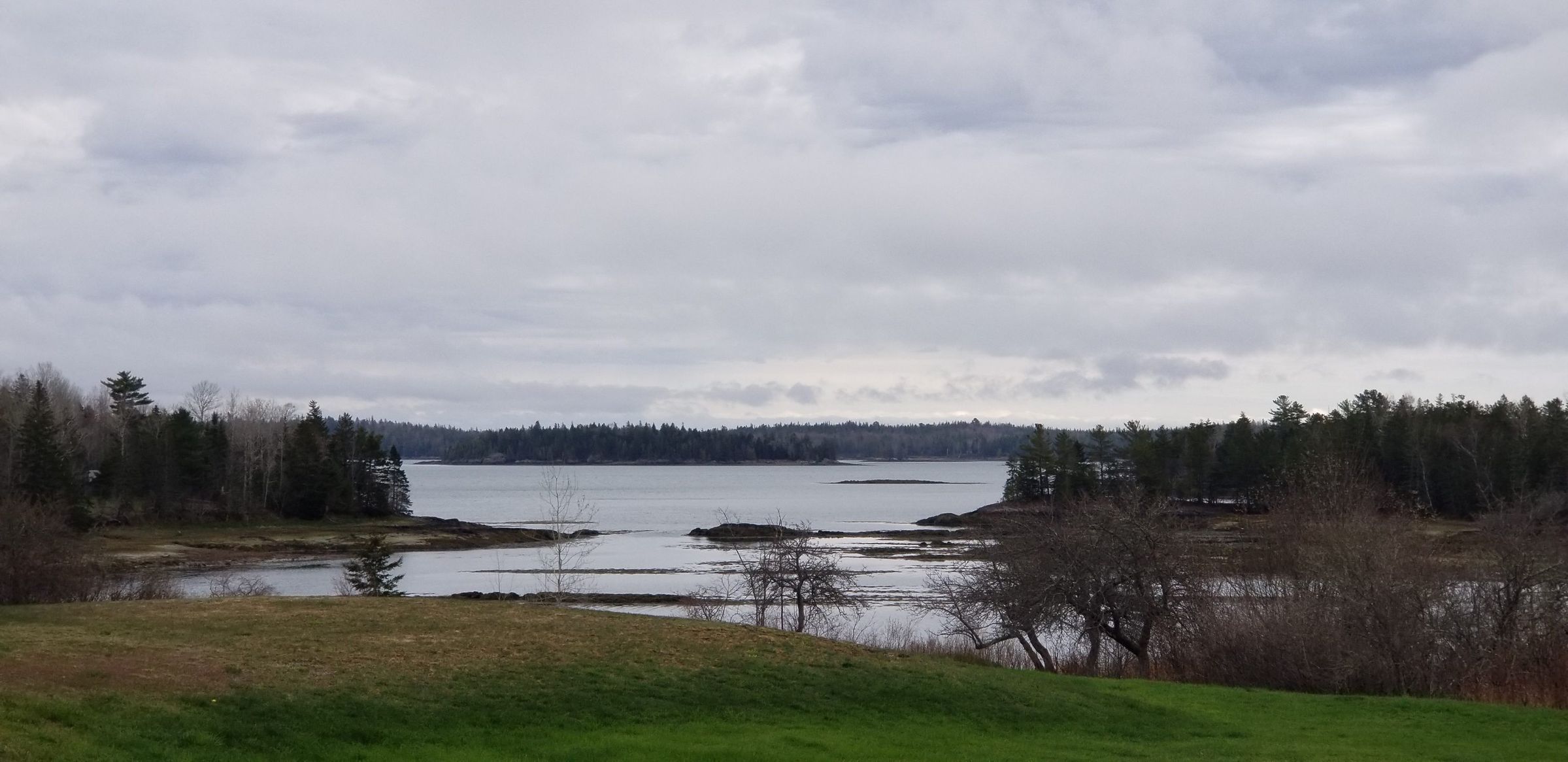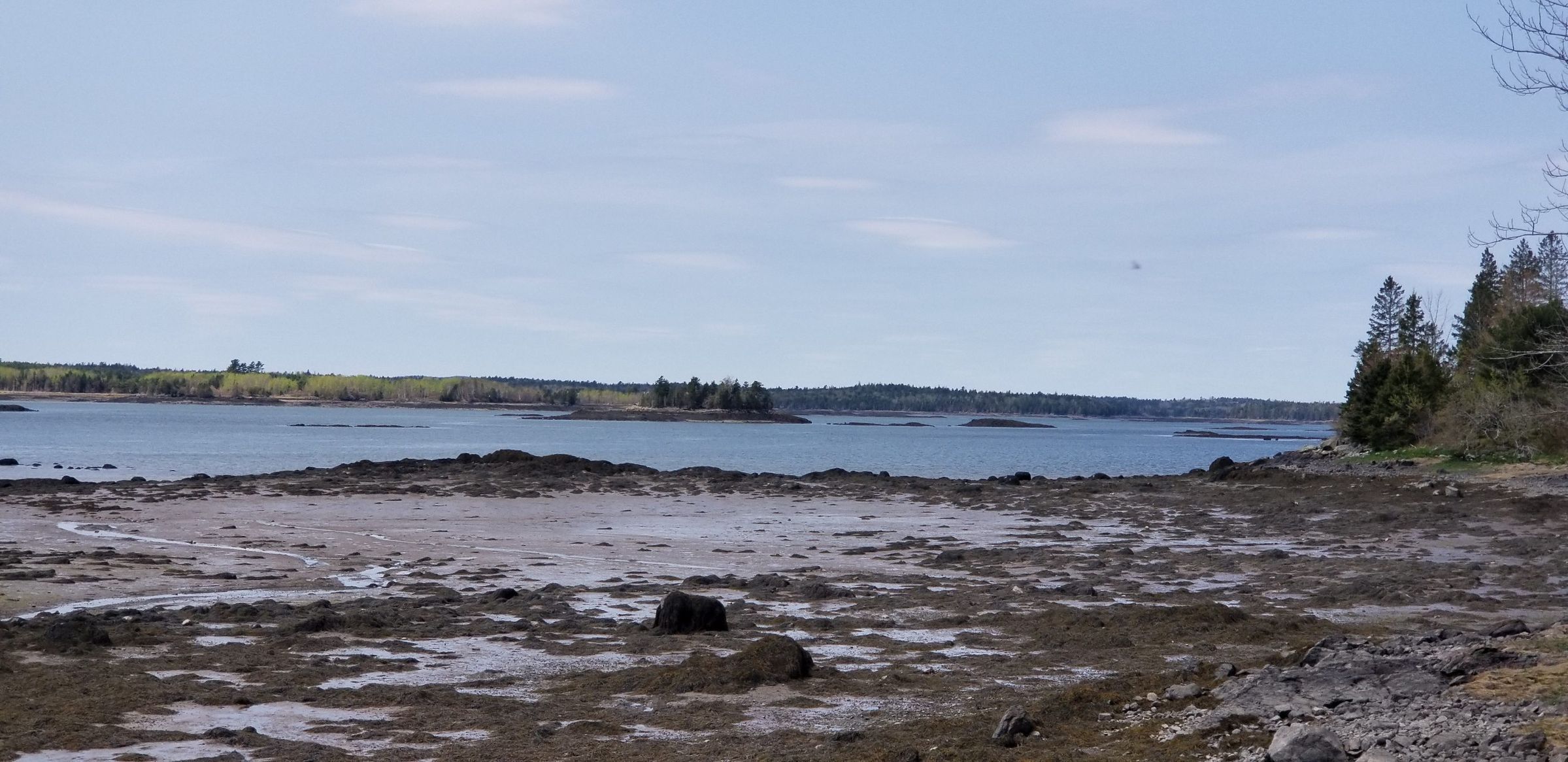 Views of Dram and Sol Seal Islands in Dennys Bay, seen at low tide from the road to the Reversing Falls on Leighton's Neck in Pembroke, originally Part of Township No. 2 in the Passamaquoddy District of eastern Maine. United State GeogeoprphicalContext