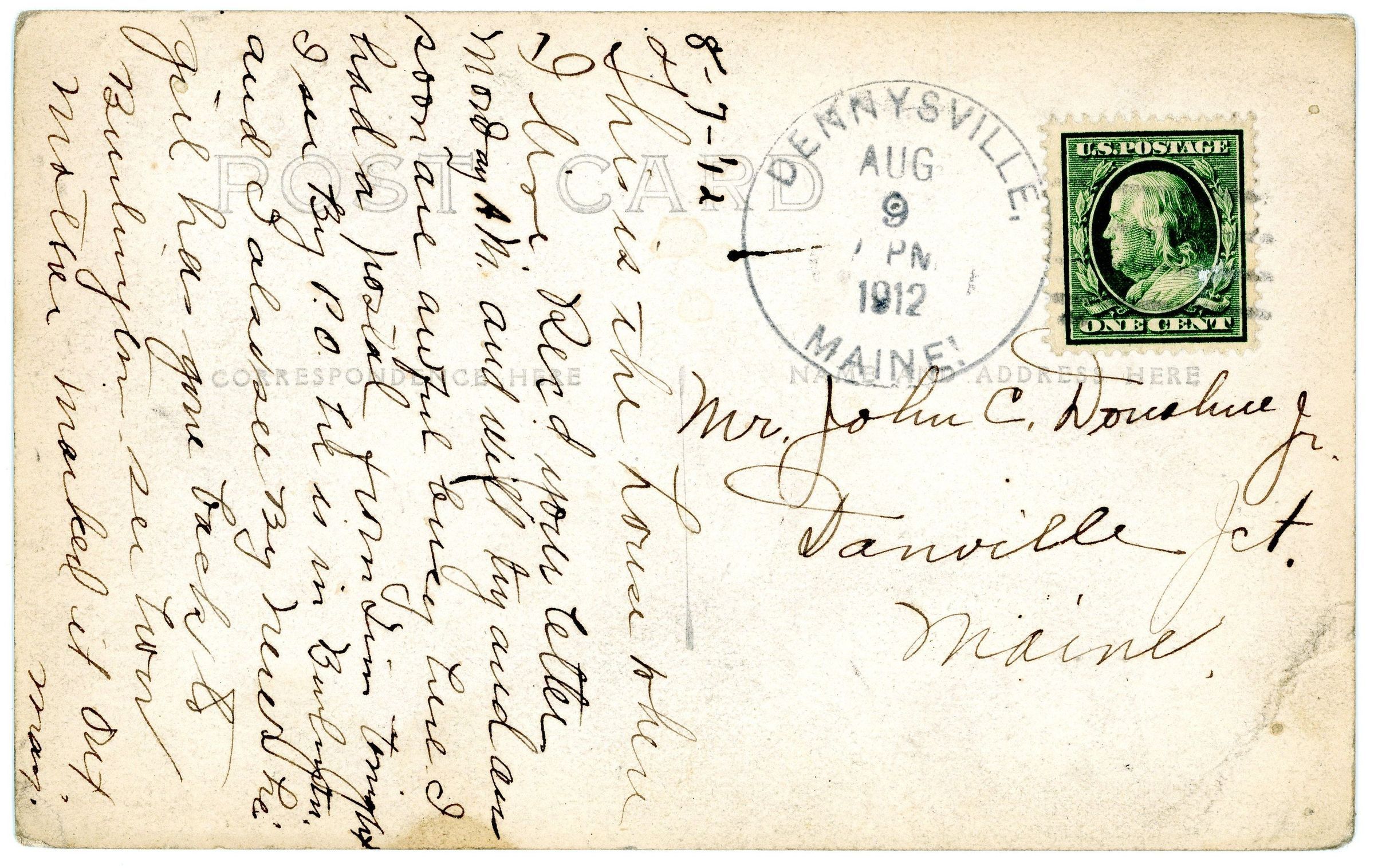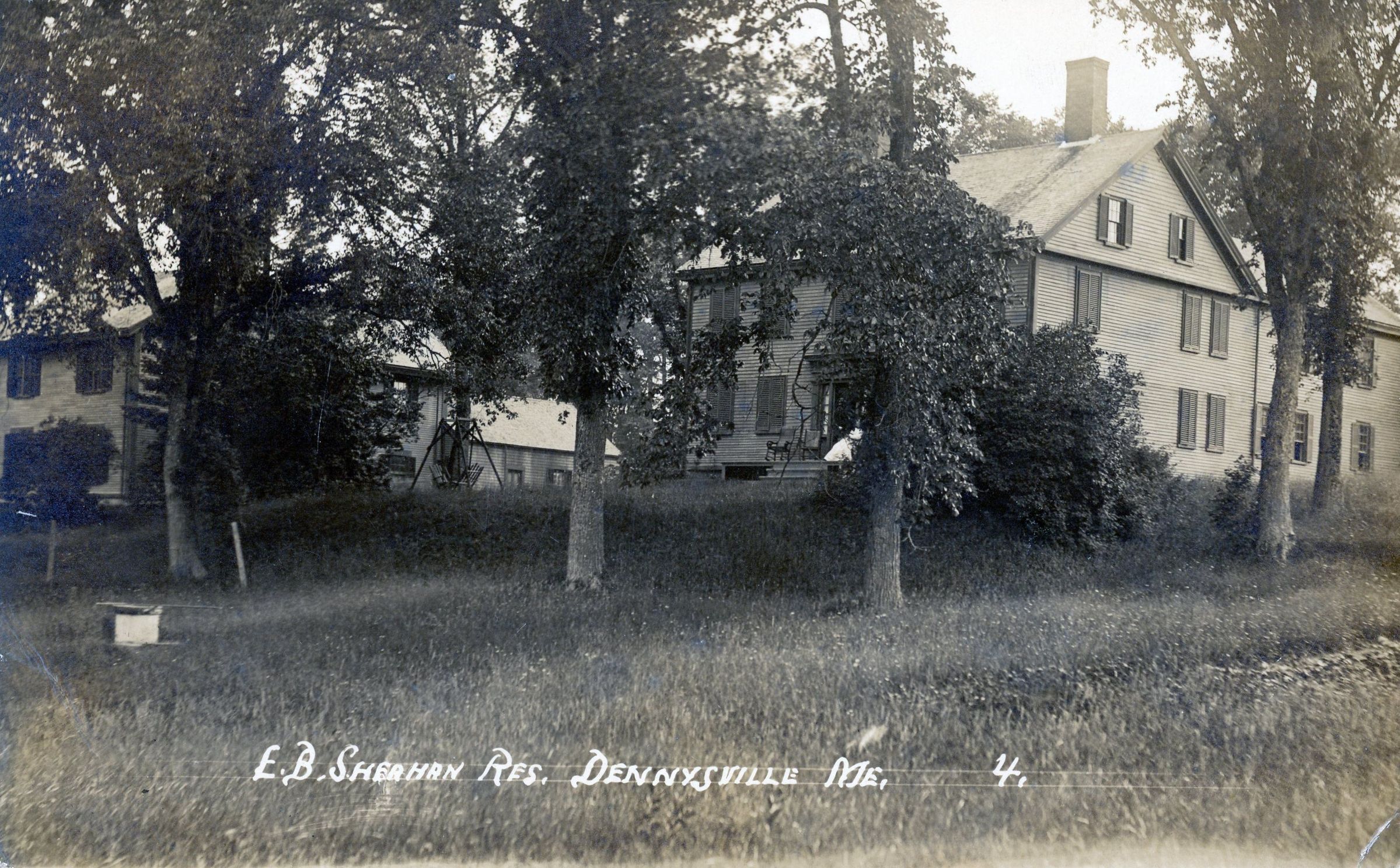 Postcard showing the house of E. B. (Ned) Sheahan, father of Dr. John P. Sheahan, Civil War veteran and photographer of many scenes around Dennysville, Edmunds and further afield. The message on the verso, mailed from Dennysville, is dated 1912, but the postcard was published somewhat earlier.Collection