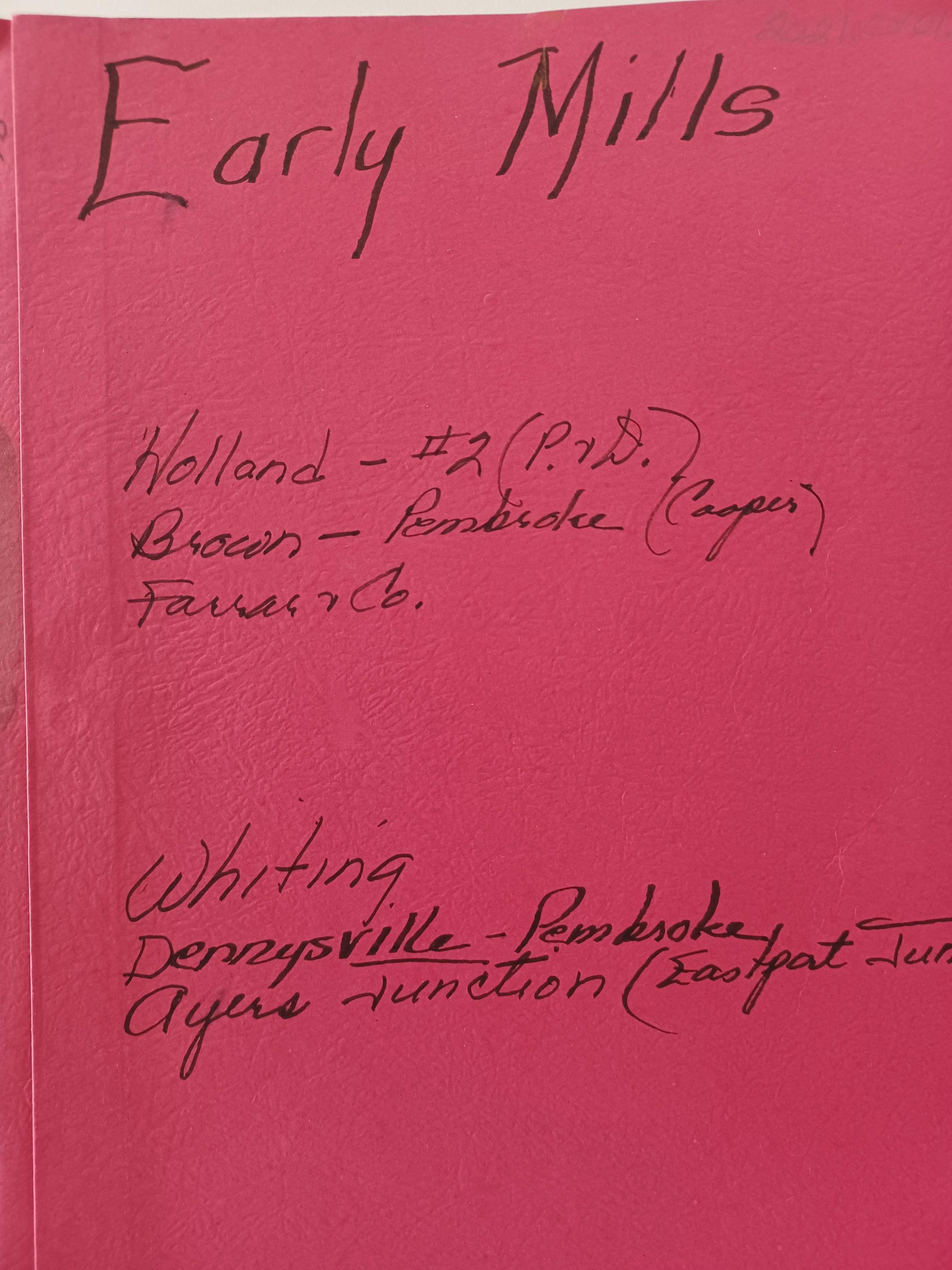 Photocopies of documents, maps and notes as well as two original photographs detailing some early mills in Washington County, Maine, including the Holland, Brown and Farrar mills.Collection