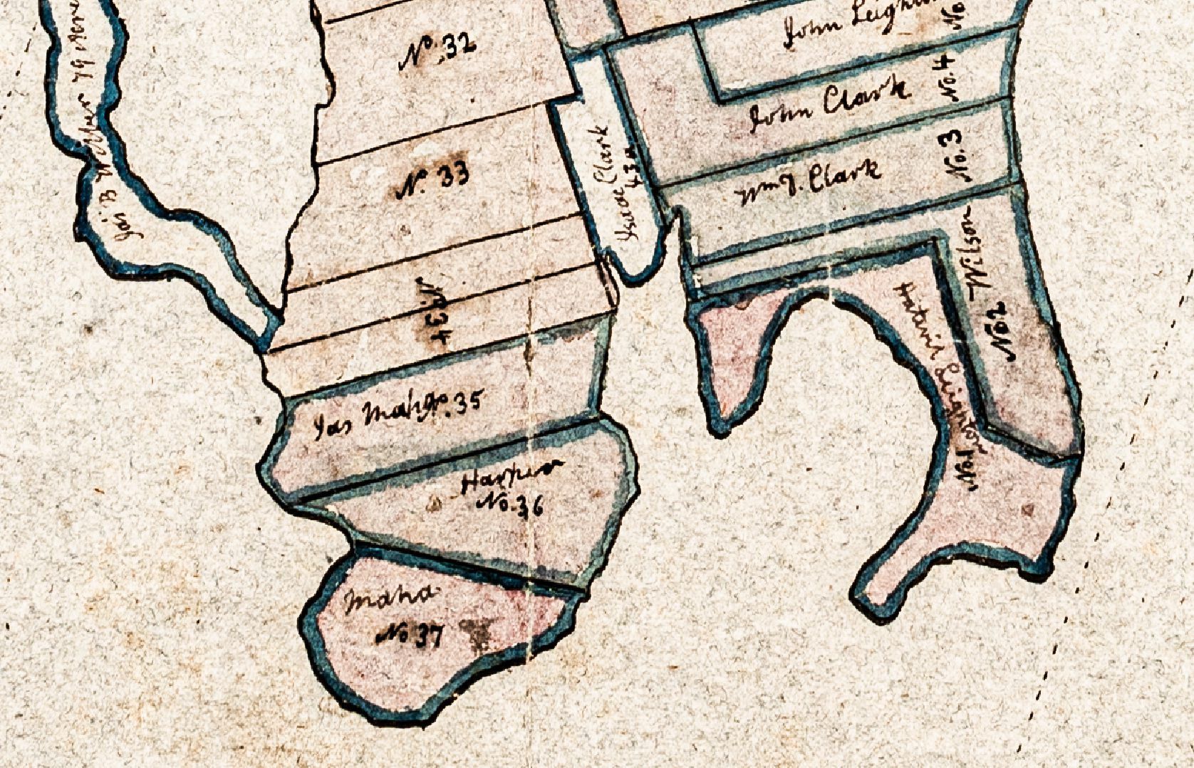 Detail of lot map showing early settlers on Mahar's Point and Leighton's Point, from a map of Townships No. 1 and 2, now Perry, Pembroke and Dennysville, c. 1805. Visible on the map are the names Wilbur, Mahar, Harper, Clark, Hatevil Leighton, and others.