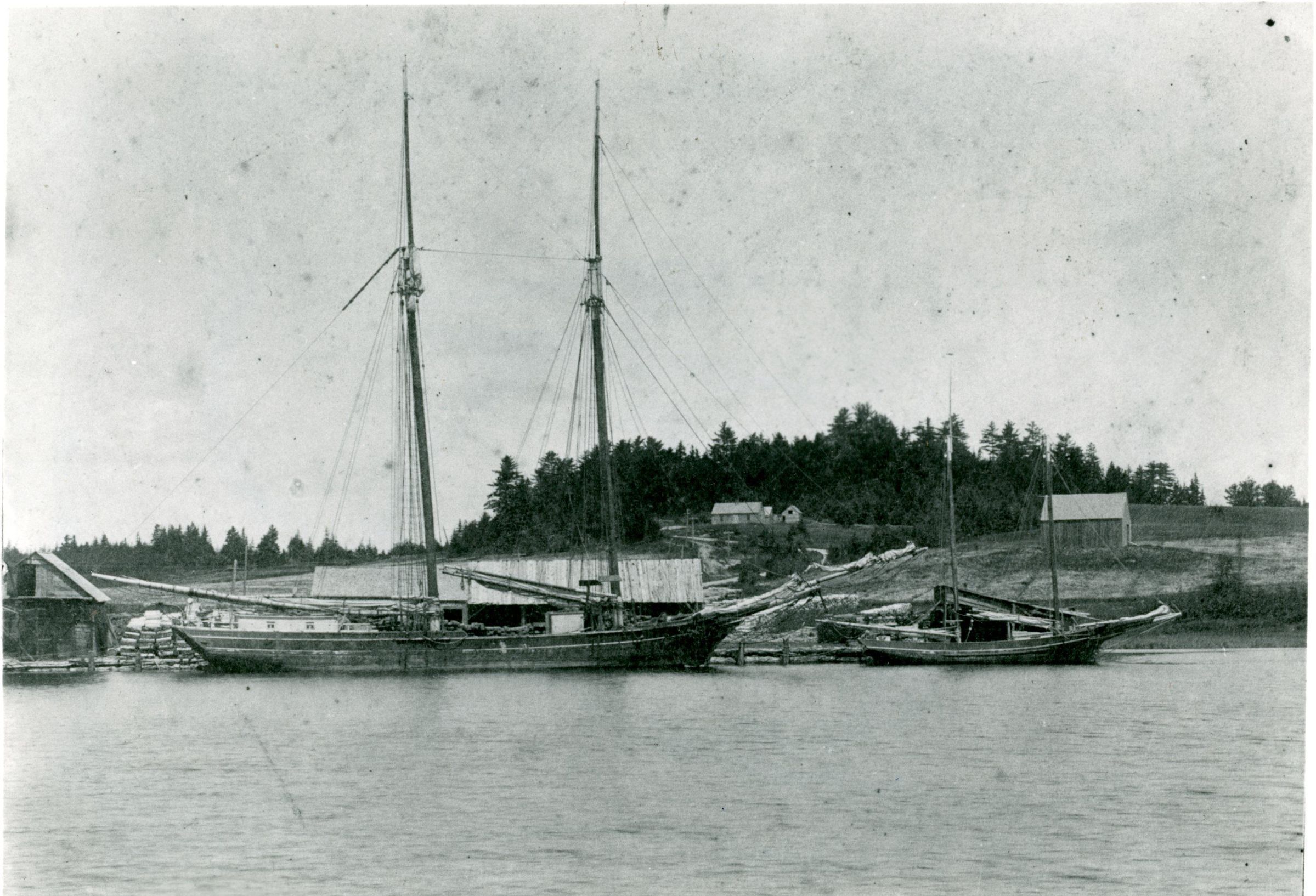 The Edmund Lincoln House is visible on Corn Hill in the distance above the bowsprit of the schooner at Lincoln's Wharf, in this photograph taken in the 1880's. Extensively altered and eventually torn down, a small field marks its former location beside the Shipyard Road in Dennysville, Maine.Collection