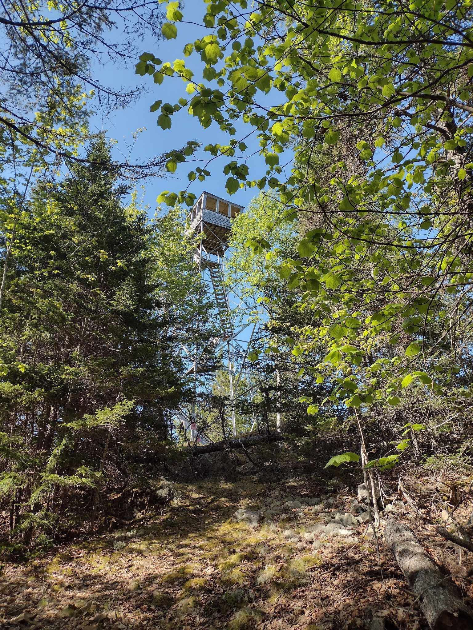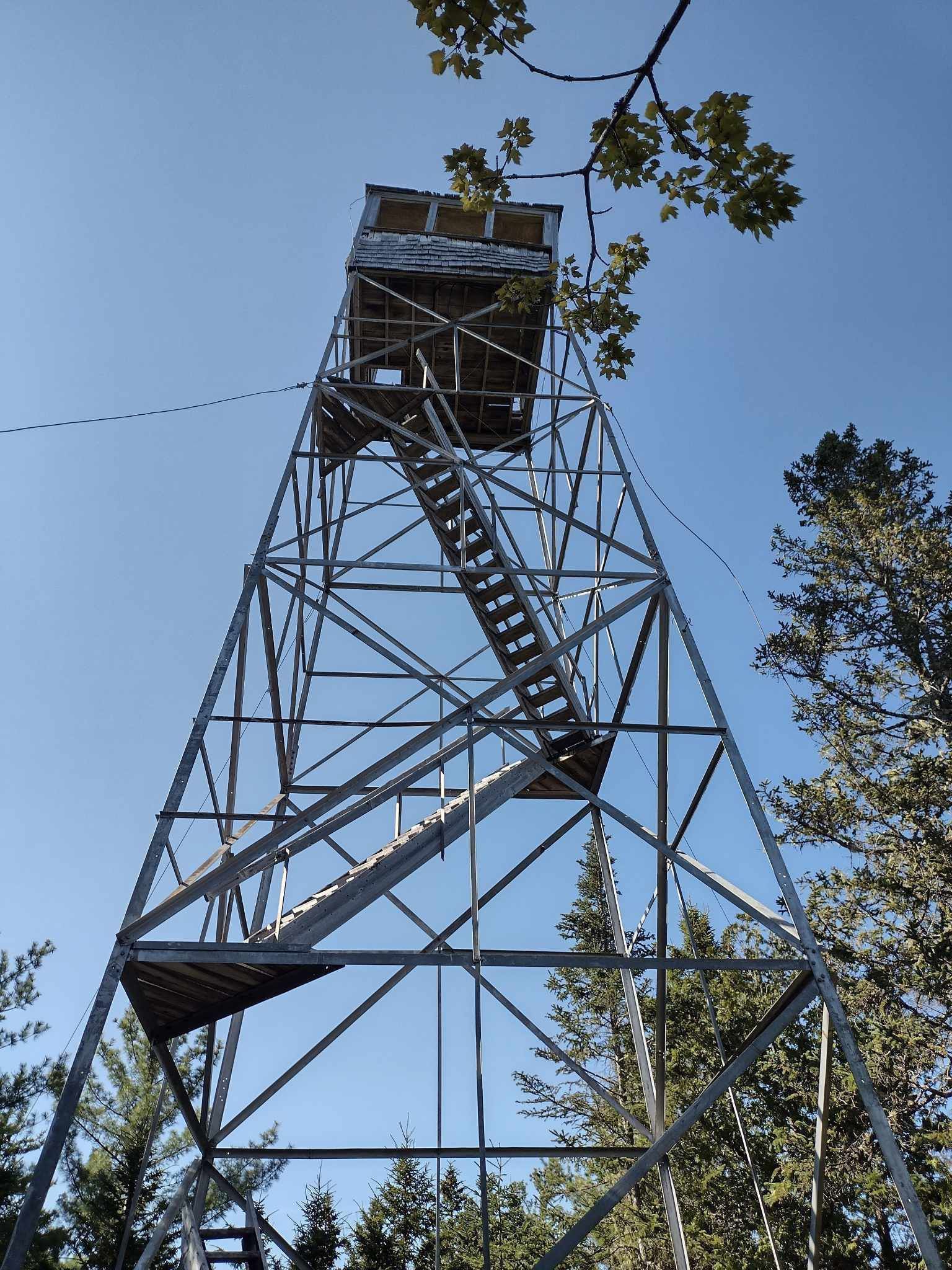 Views of the now disused fire tower at Little's Mountain, Cobscook Bay State Park, in Edmunds, Maine.Context