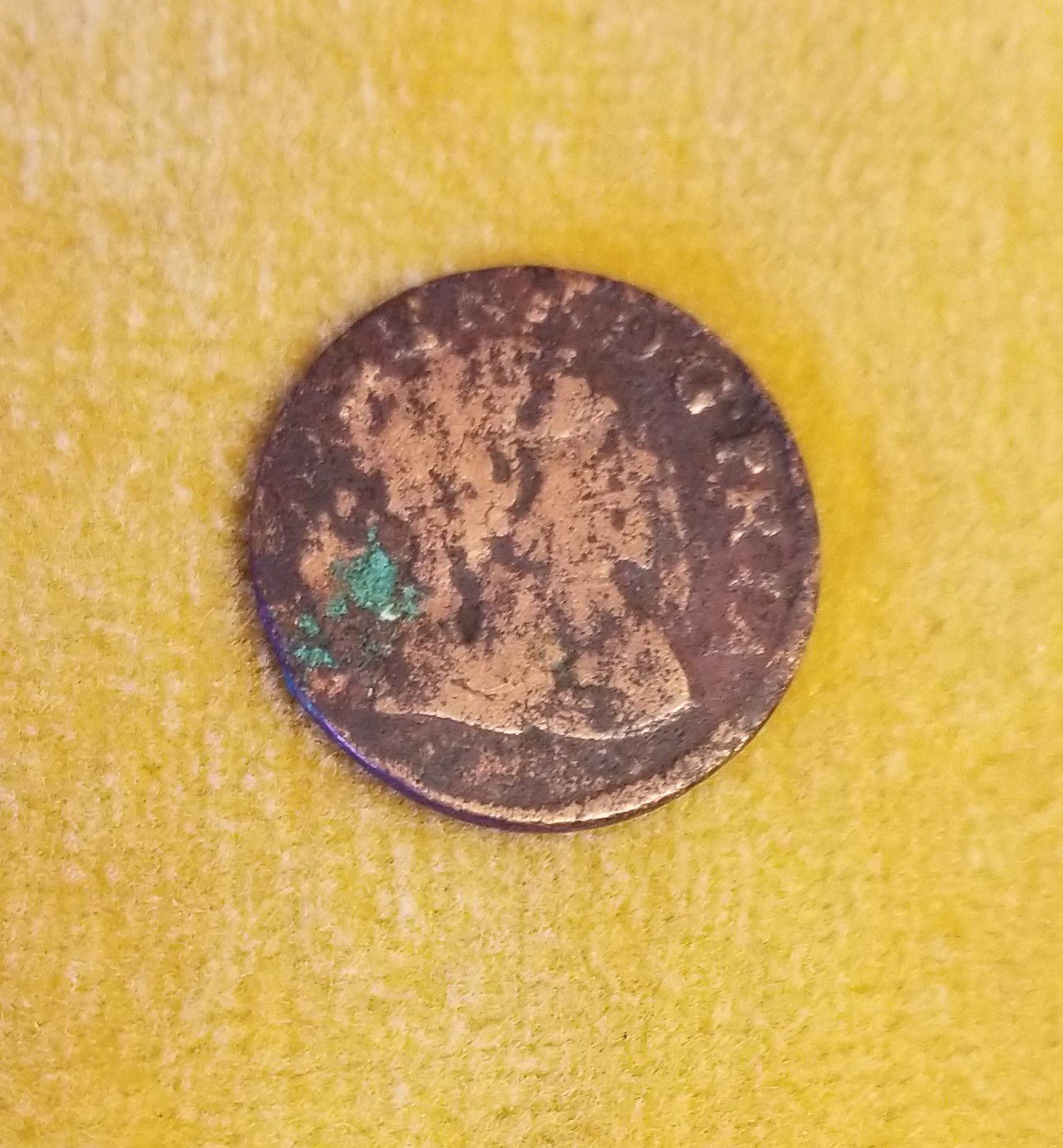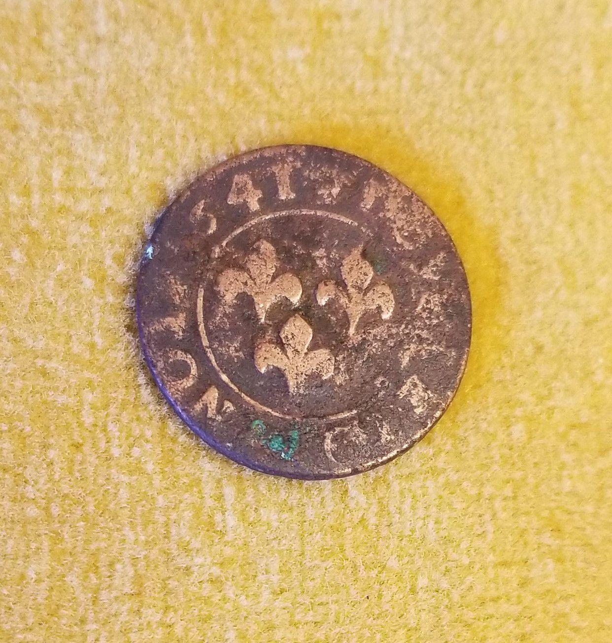 A small French copper coin known as a "Double Tournois" with a bust of Frederick Henri on the obverse and three Fleur des Lis, and the date 1641 on the reverse, found in Edmunds, Maine, near the site of old Acadian house which burned in 1785. The mint name is "Orange".Collection