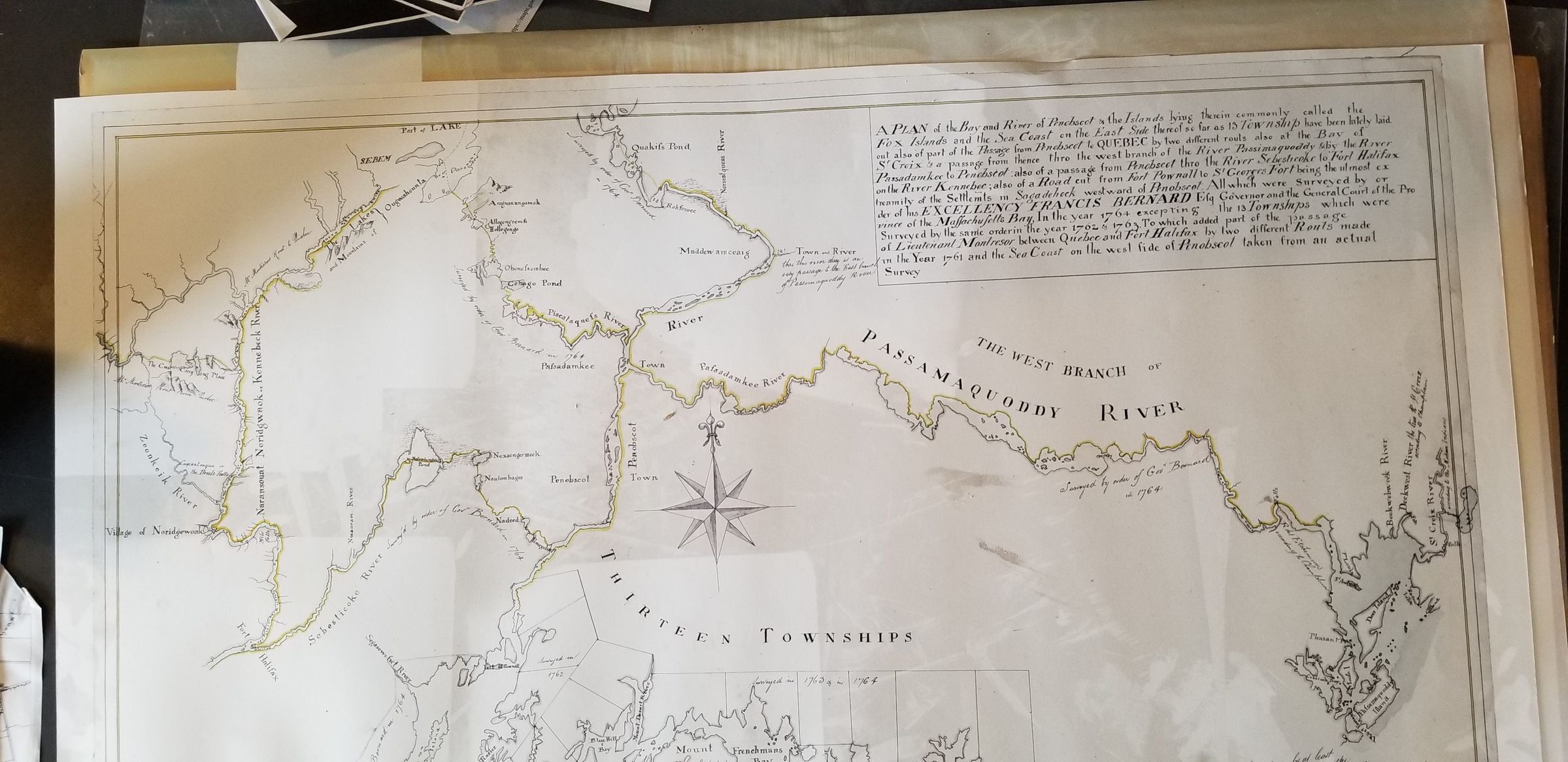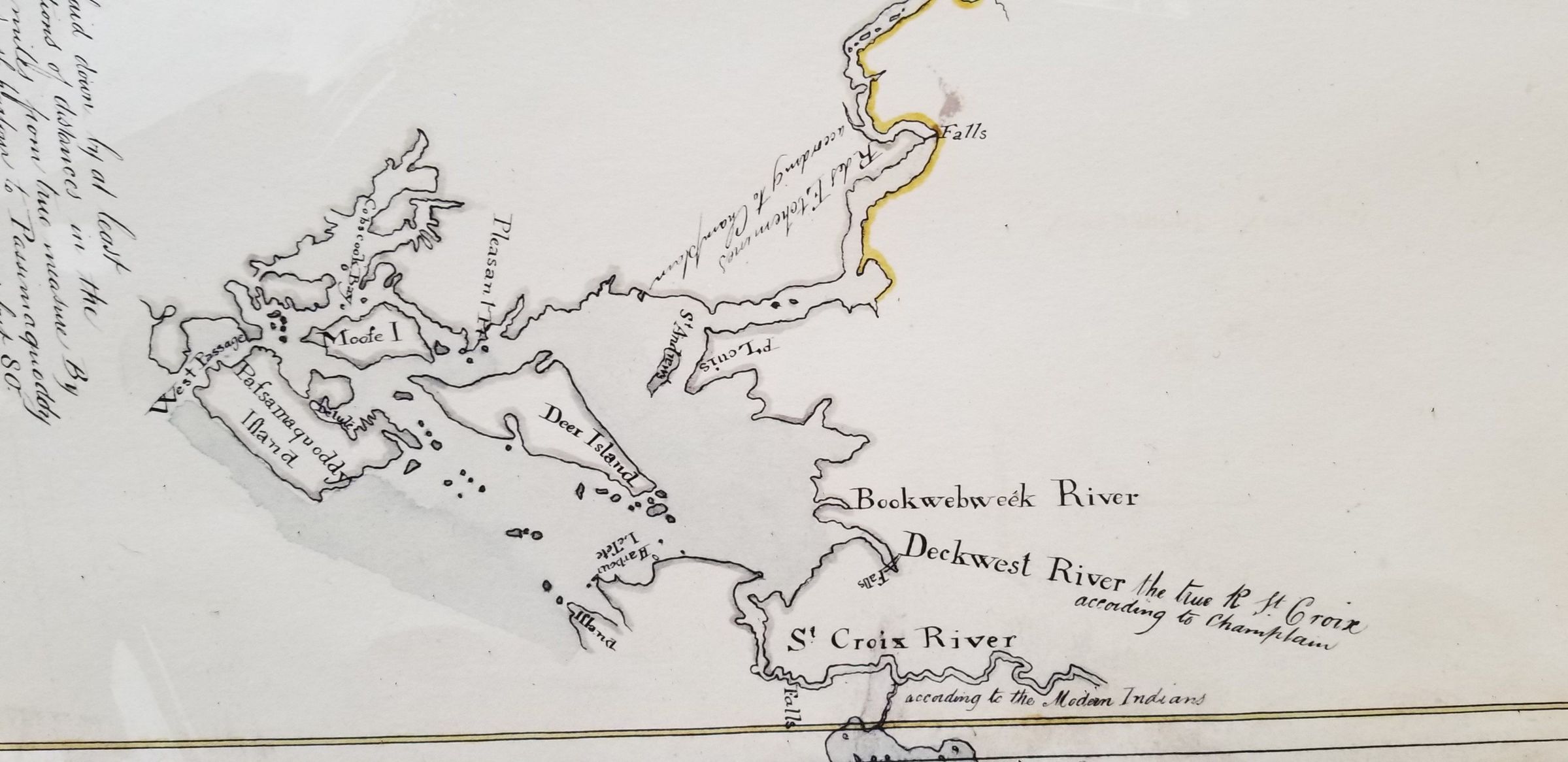 Details of the map commissioned by Massachusetts Governor Sir Francis Bernard of Passamaquoddy and Cobscook Bays in Eastern Maine, in 1764.Photograph Details