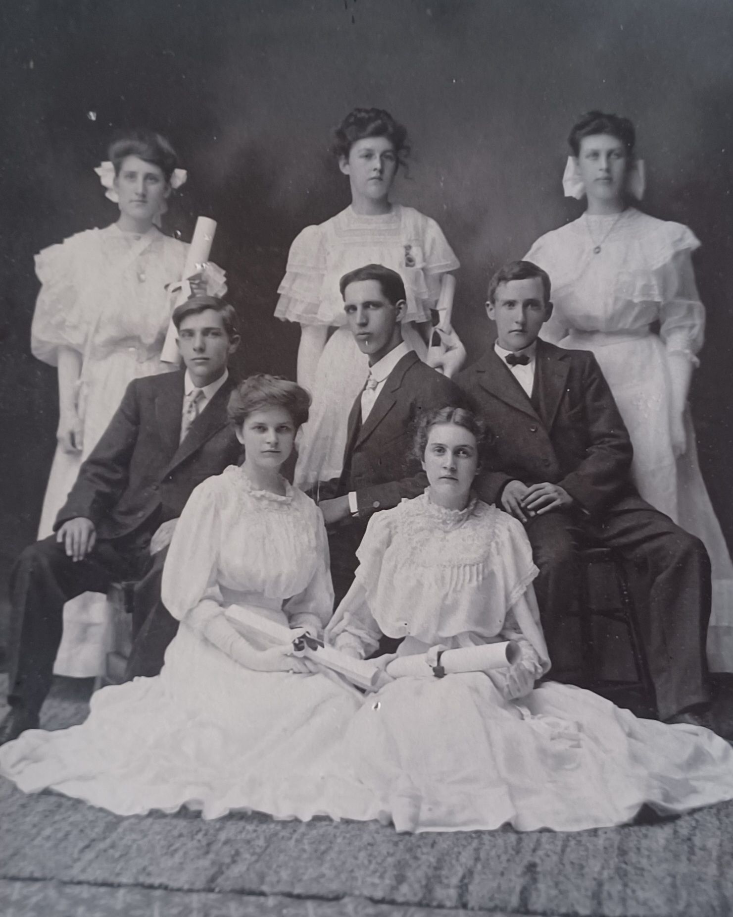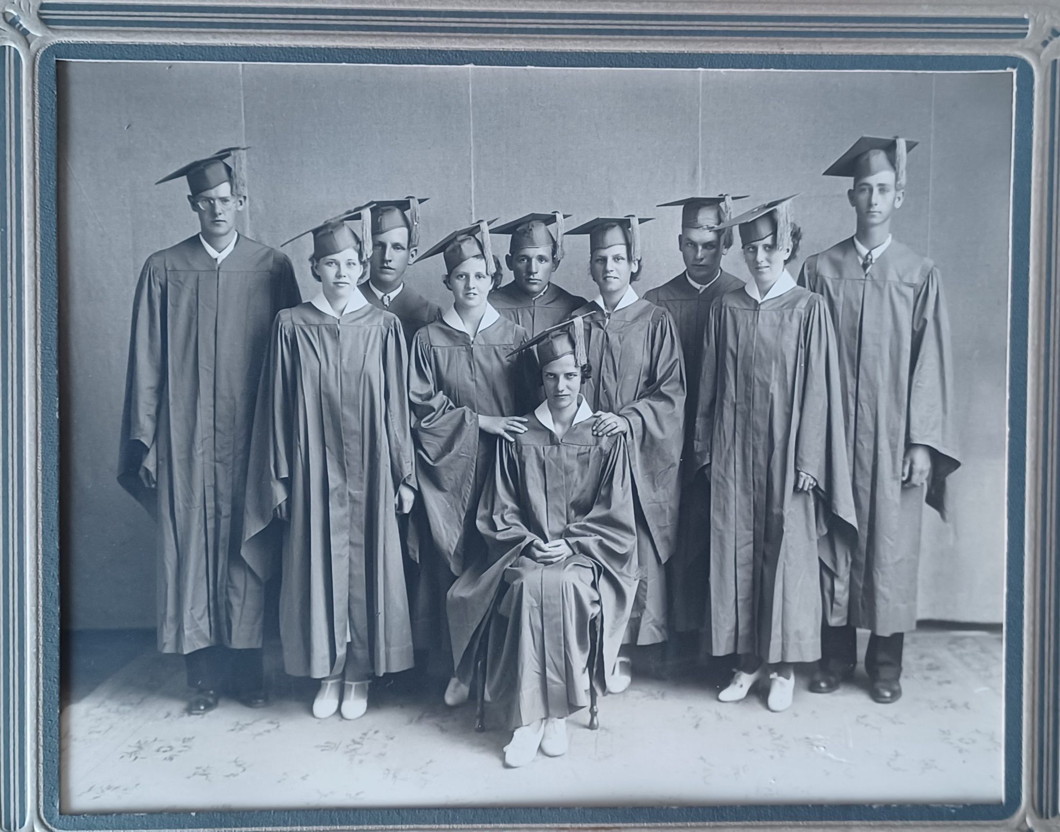 Two large matted photographs. The first image shows ten unidentified young men and women in graduation caps and gowns, probably around 1935. The second shows eight unidentified young men and women, the women in white dresses holding rolled and tied certificates, probably around 1900.Collection