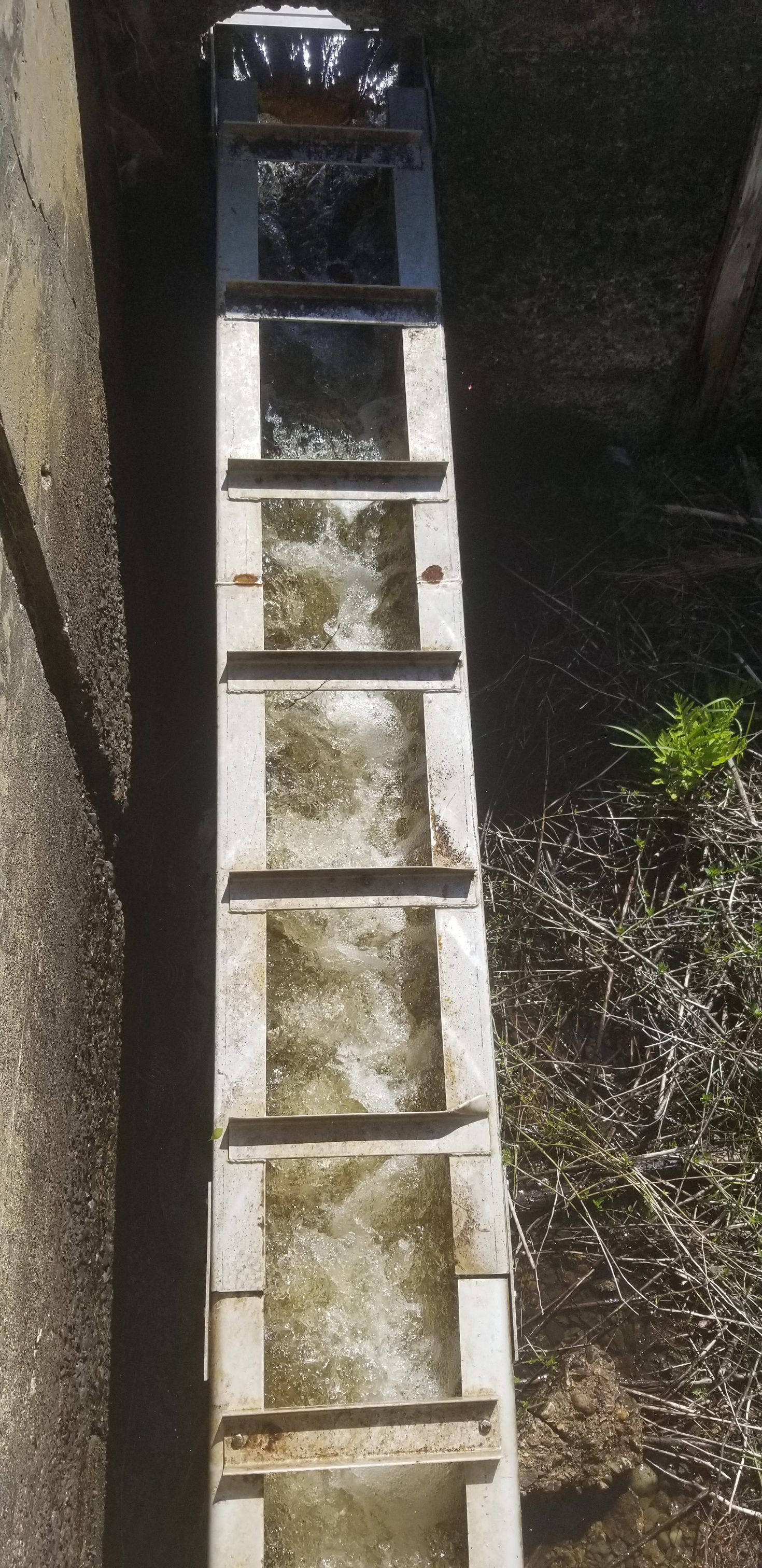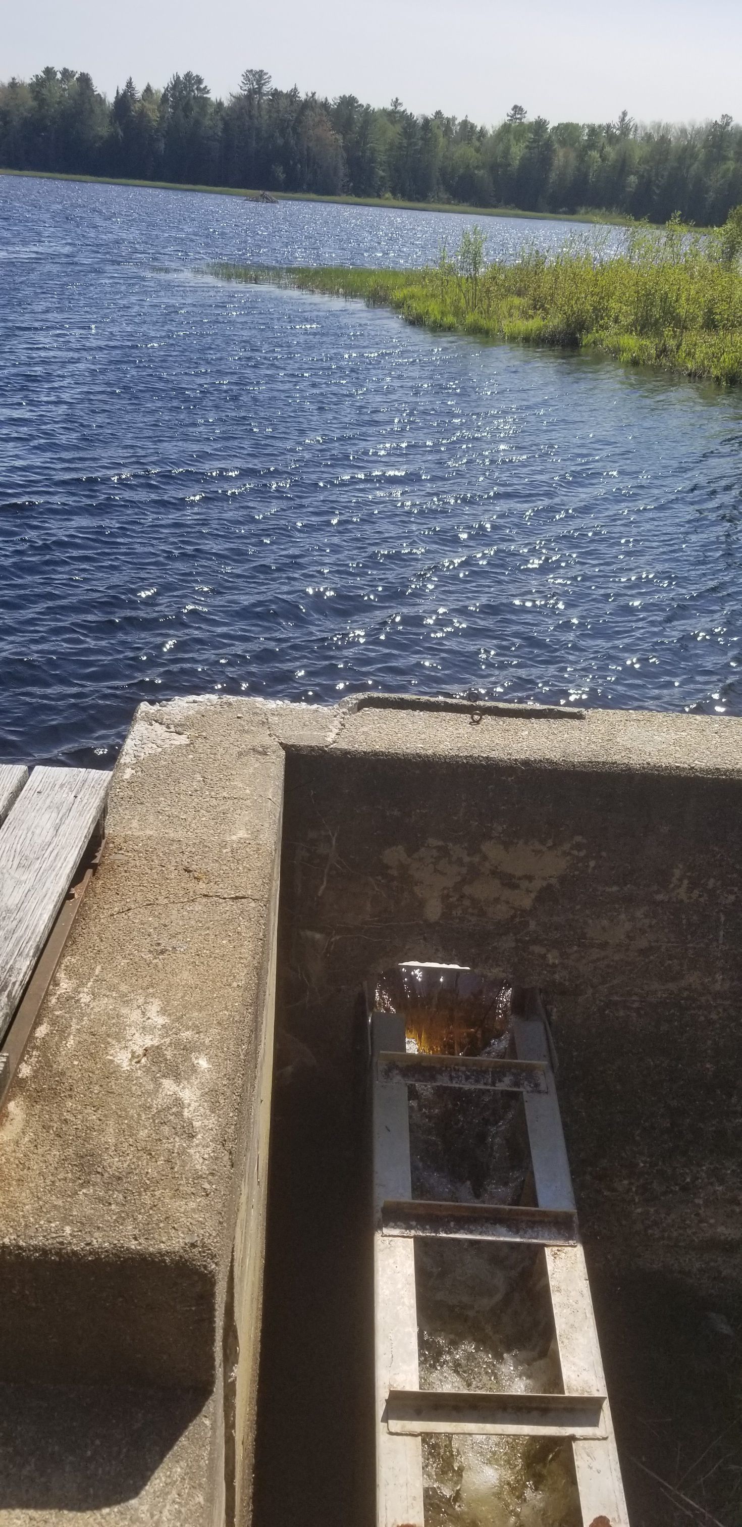 Fish ladder beside the dam at Great Works on Cathance Stream, Edmunds, Maine, is under the management of the Maine Department of Inland Fisheries and Wildlife, as part of the Great Works Wildlife Management Area.Context