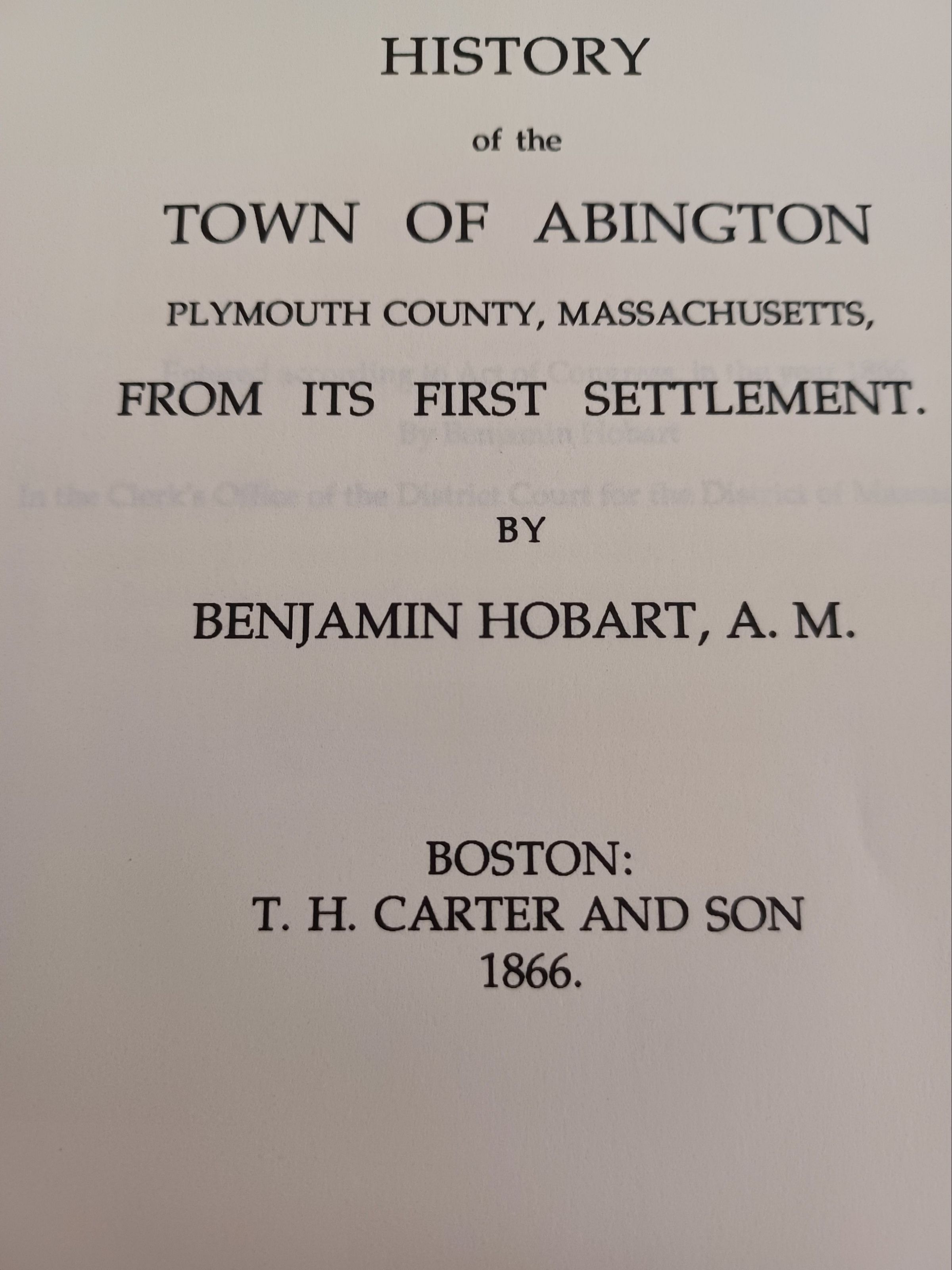 Copy of selected pages of History of the Town of Abington Plymouth County, Massachusetts, from its First Settlement by Benjamin Hobart, A.M. Boston: T.H. Carter and Son, 1866Collection